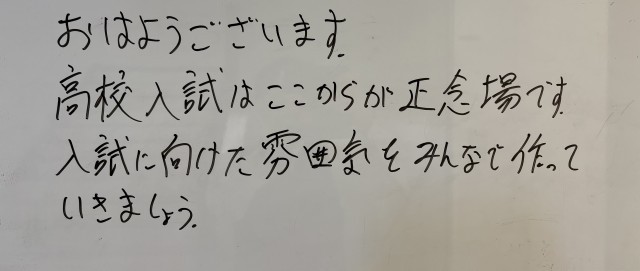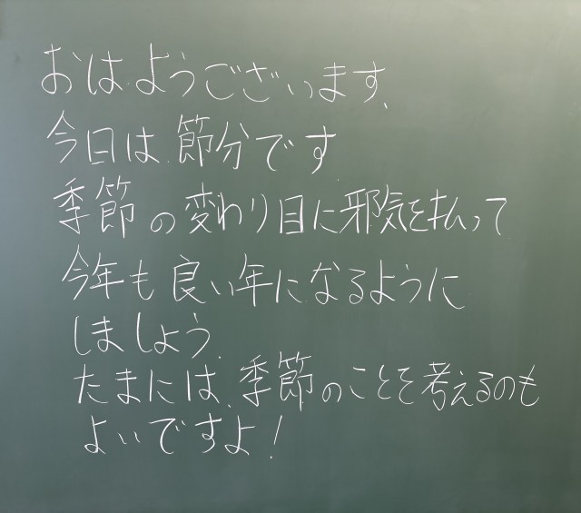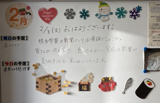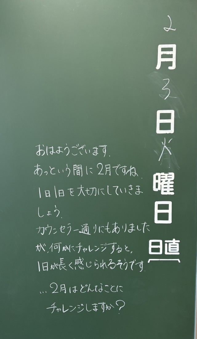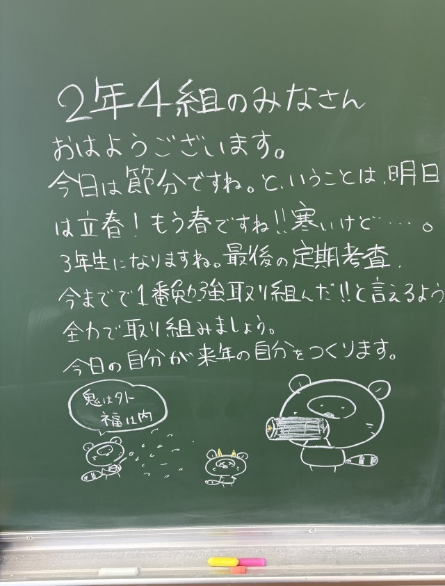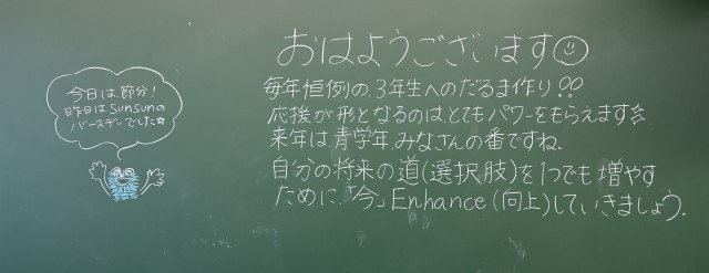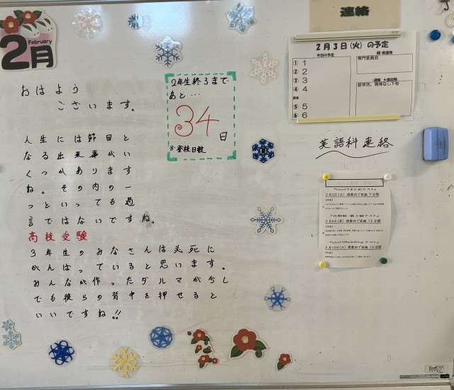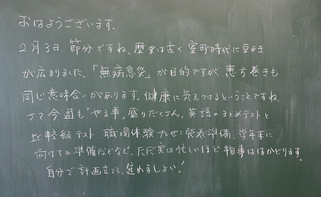 2月3日(火)の朝に校舎内を巡回していたら、学年主任や学級担任の先生からのメッセージが書いてありました。