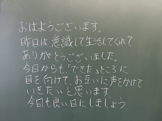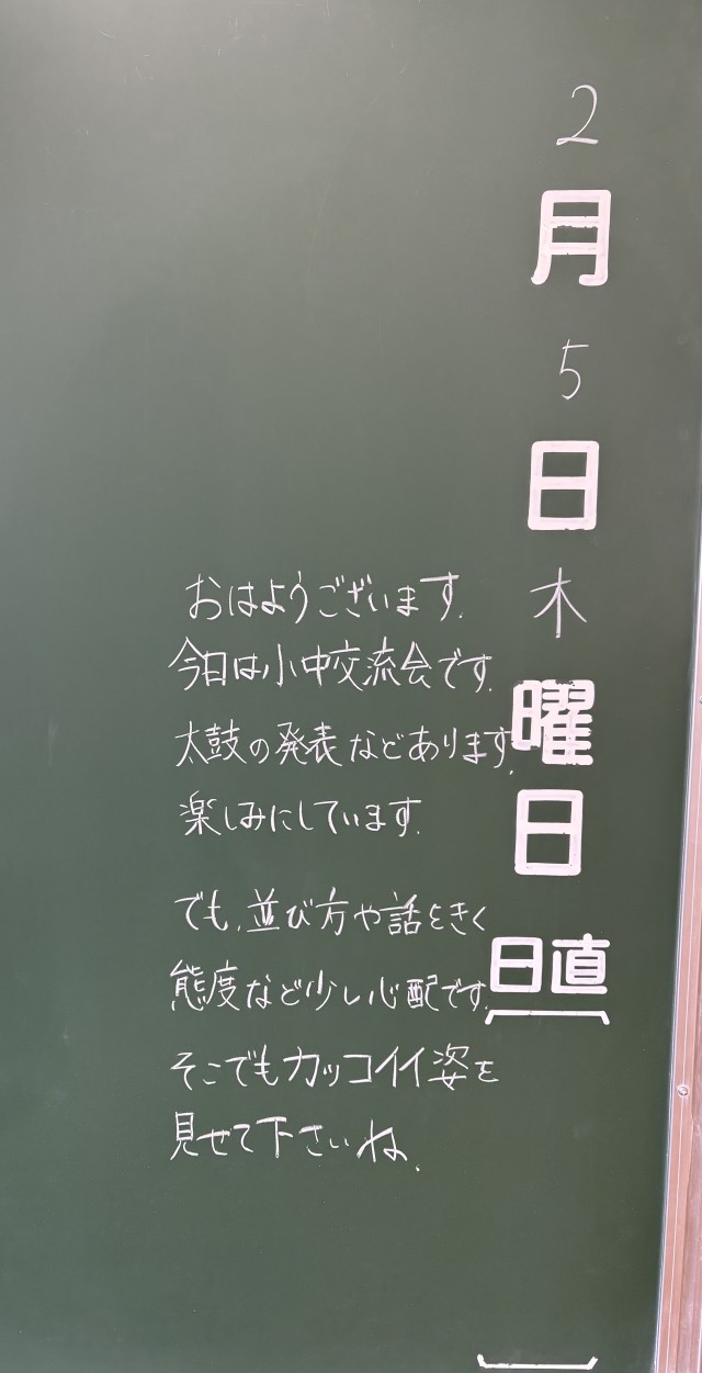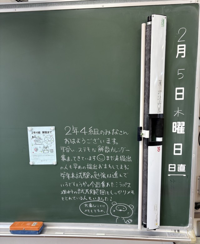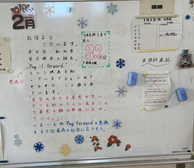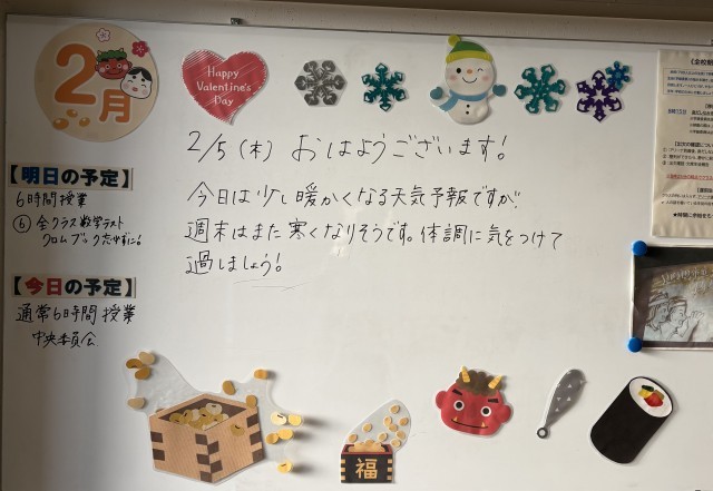 2月5日(木)の朝に校舎内を巡回していたら、学年主任や学級担任の先生からのメッセージが書いてありました。