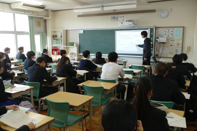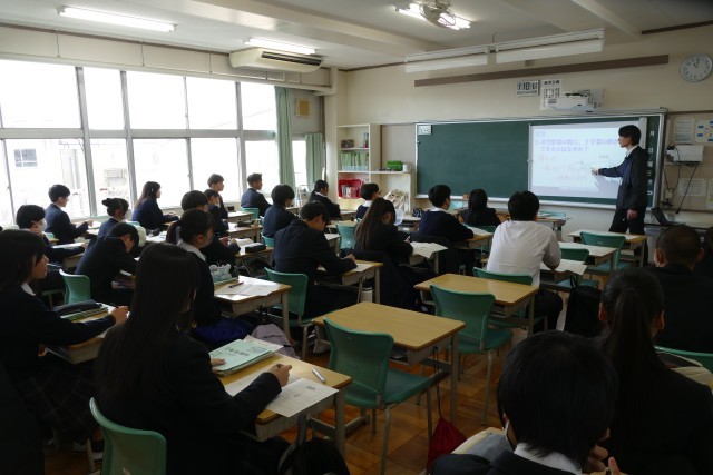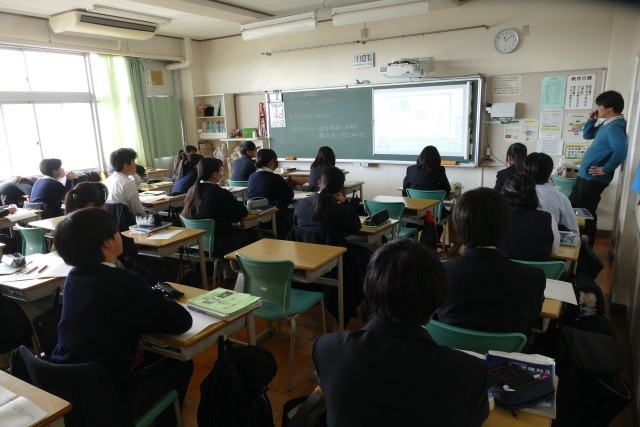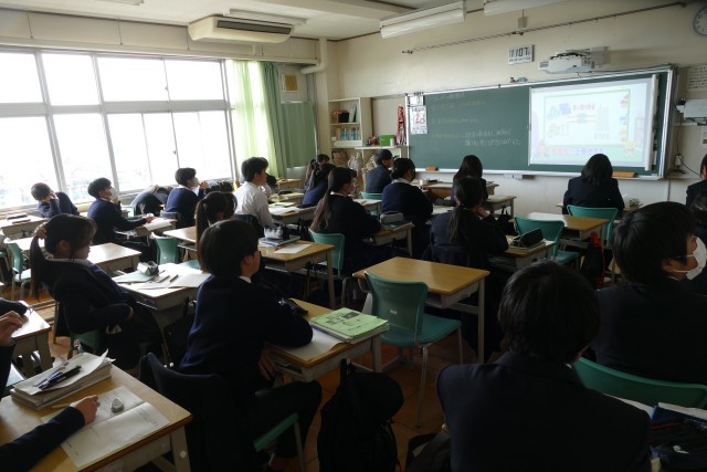 2月6日(金)3校時の理科の授業の様子です。3年生の教室では、M先生が「再生エネルギーと放射線」の授業を教えていました。授業のめあては「再生エネルギーと放射線を理解する」です。2年生の教室では、T先生が「放電」の授業を教えていました。授業のめあては「ーの電気がー極から+極に移動していることを理解させる」です。