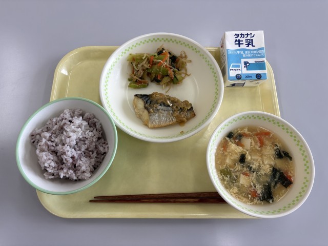 今日の給食のメニューは、黒米入りごはん、牛乳、さばのねぎみそがけ、もやしと町田産キャベツのごま和え、むらくも汁です。むらくも汁が温かくてとても美味しかったです。ご馳走さまでした。