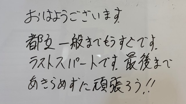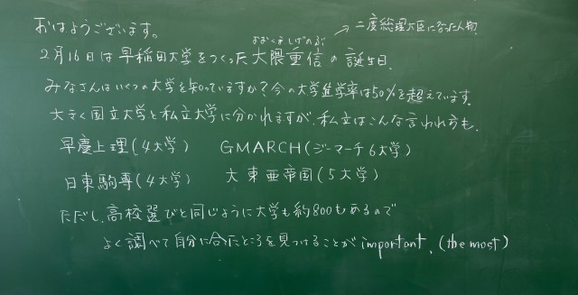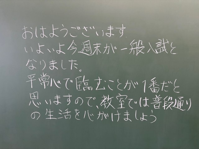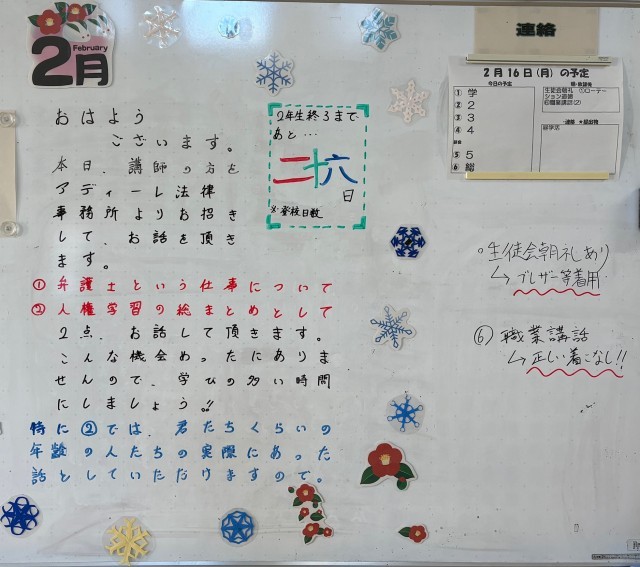2月16日(月)の朝に校舎内を巡回していたら、学年主任や学級担任の先生からのメッセージが書いてありました。