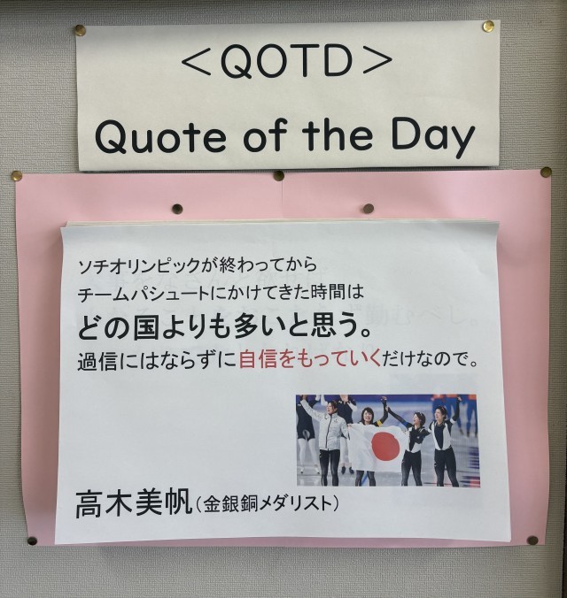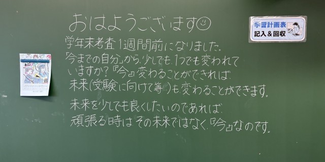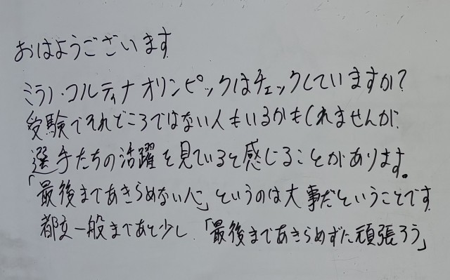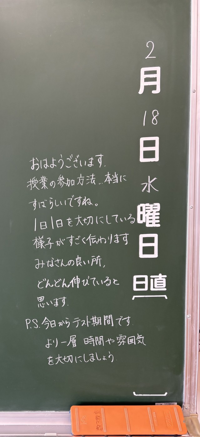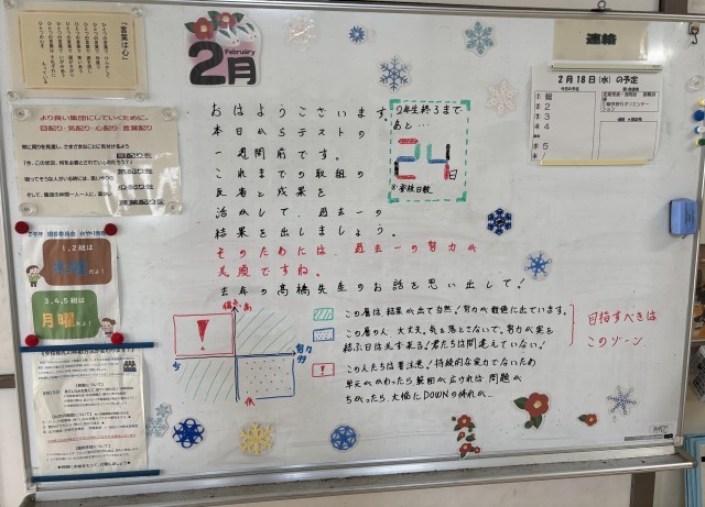 2月18日(水)の朝に校舎内を巡回していたら、学年主任や学級担任の先生からのメッセージが書いてありました。