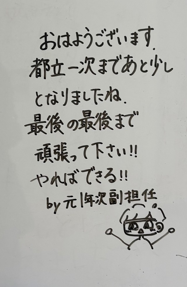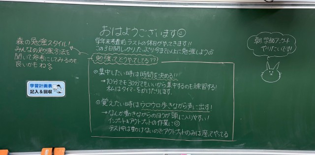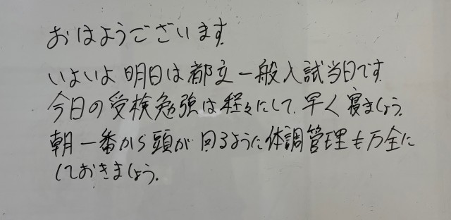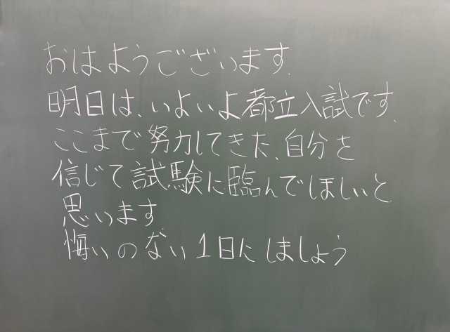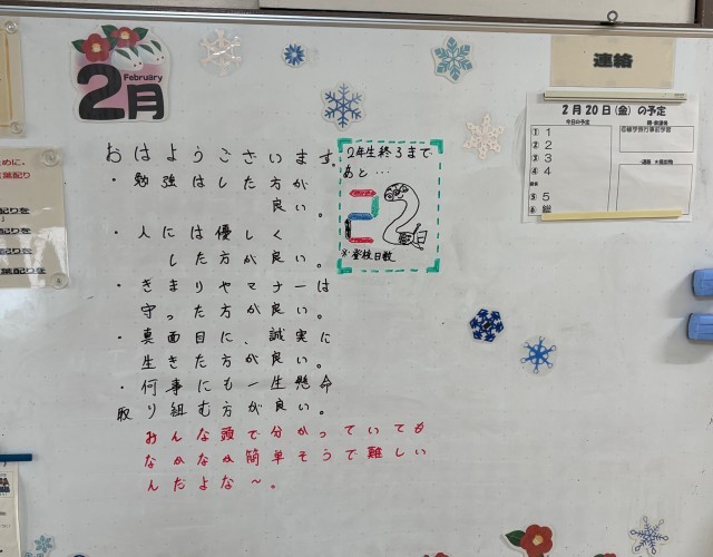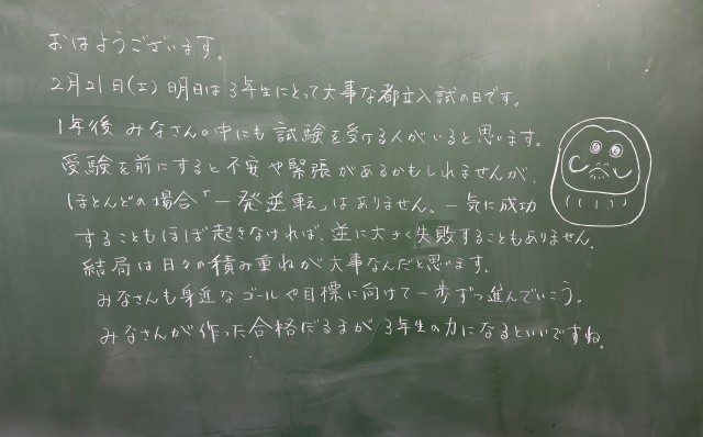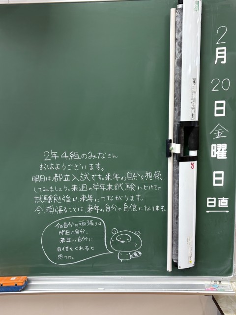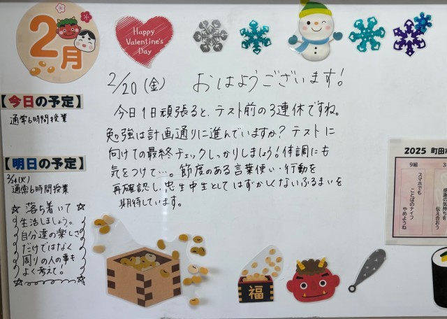 2月20日(金)の朝に校舎内を巡回していたら、学年主任や学級担任の先生からのメッセージが書いてありました。