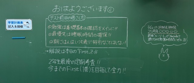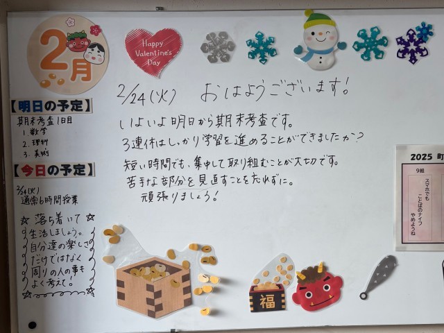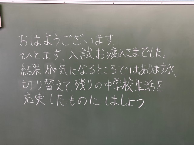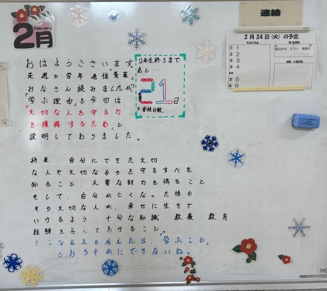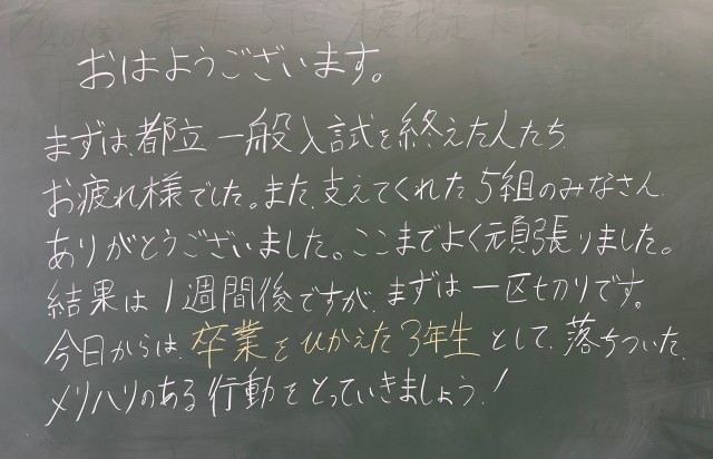 2月24日(火)の朝に校舎内を巡回していたら、学年主任や学級担任、元副担任の先生からのメッセージが書いてありました。
