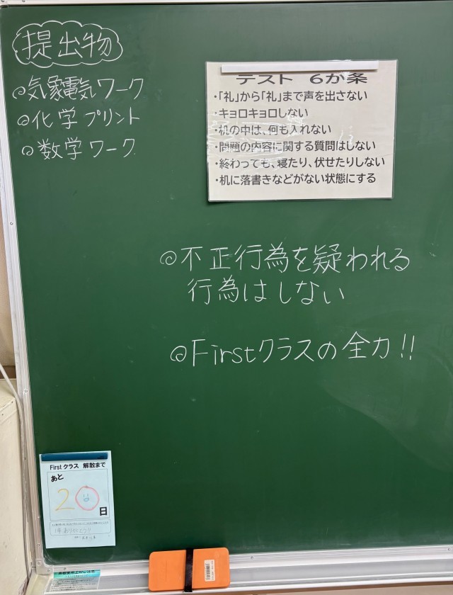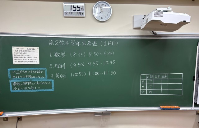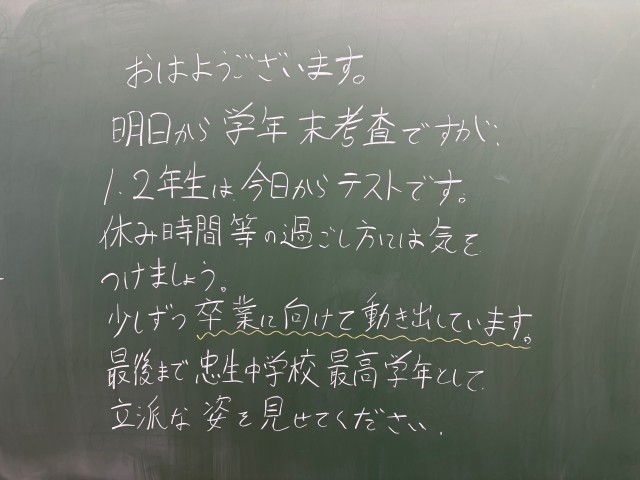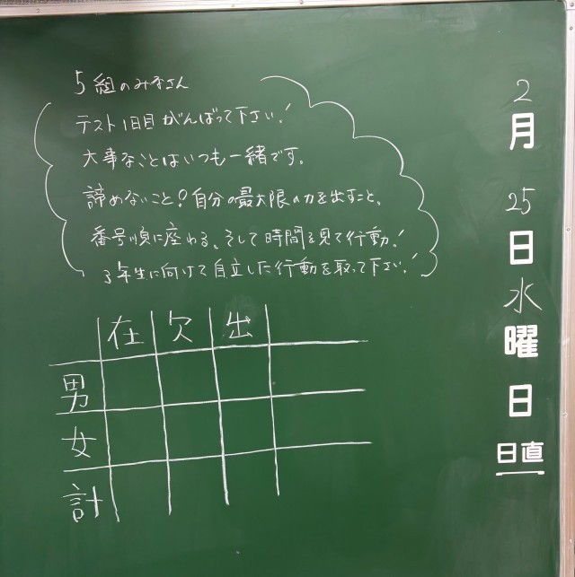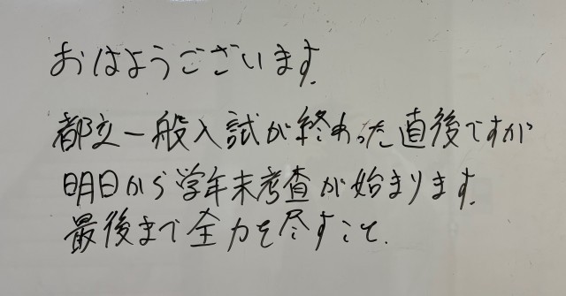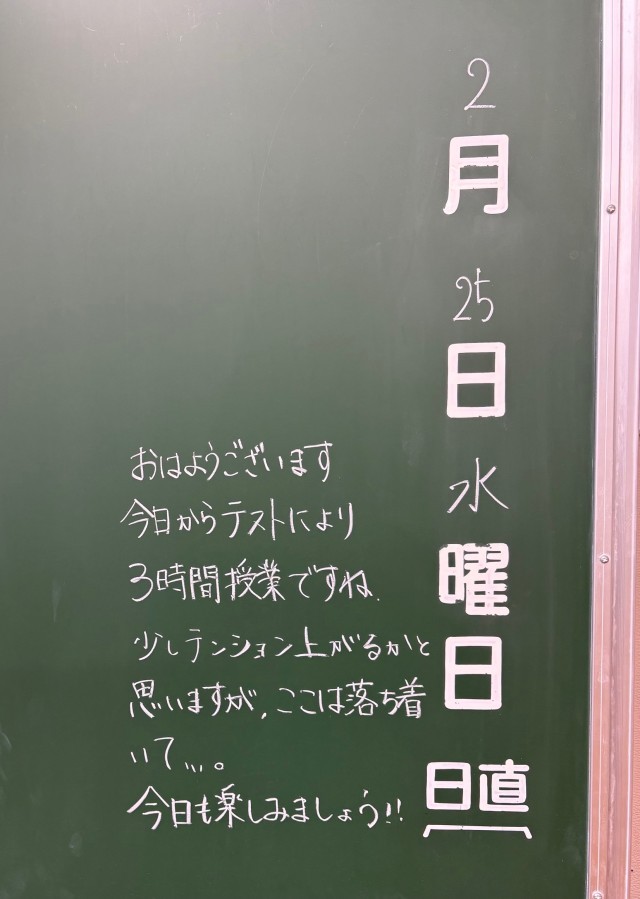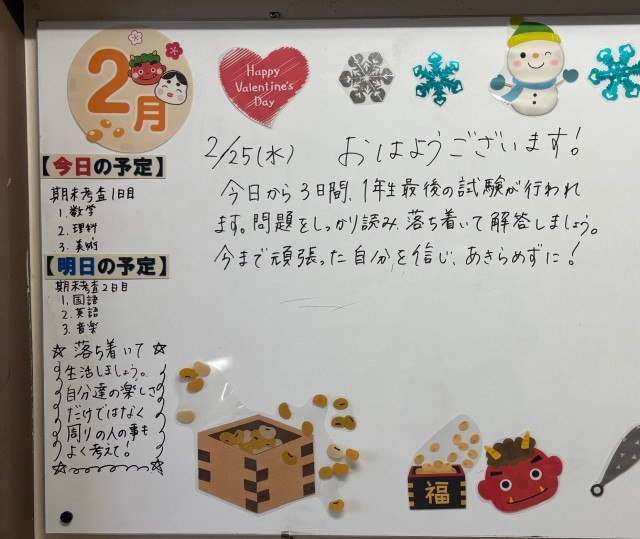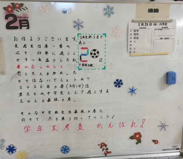 2月25日(水)の朝に校舎内を巡回していたら、学年主任や学級担任の先生からのメッセージが書いてありました。