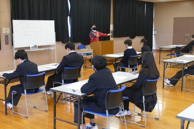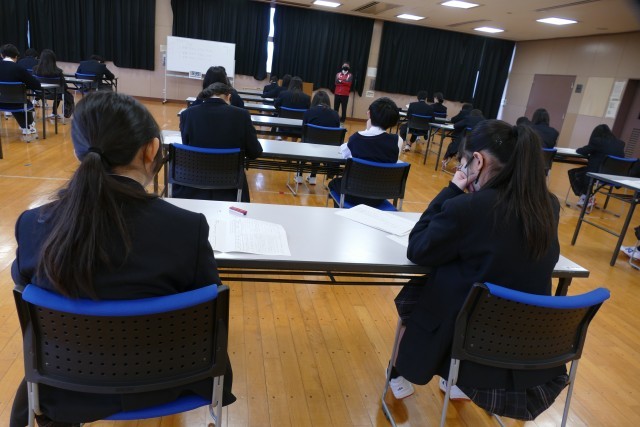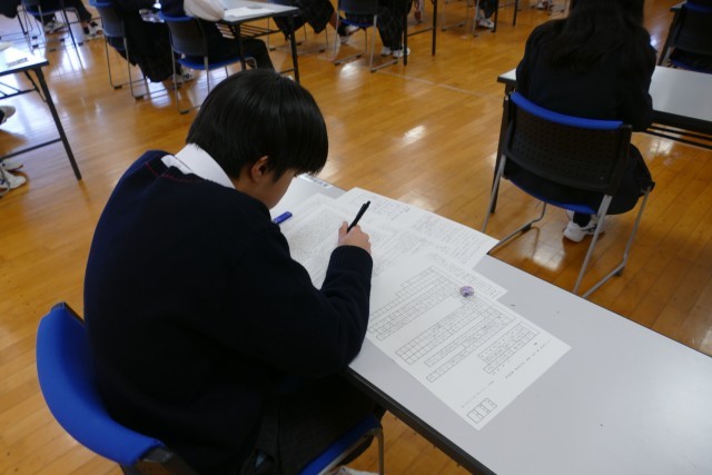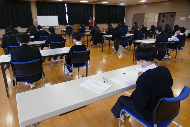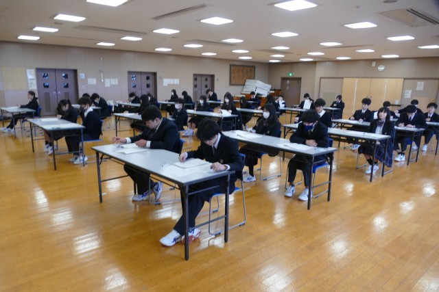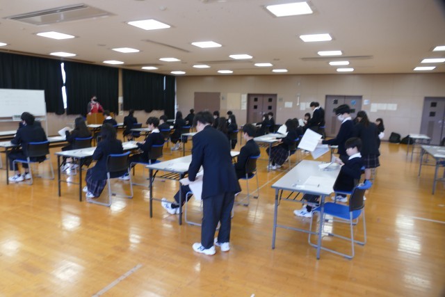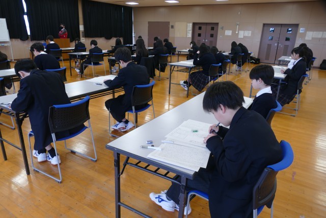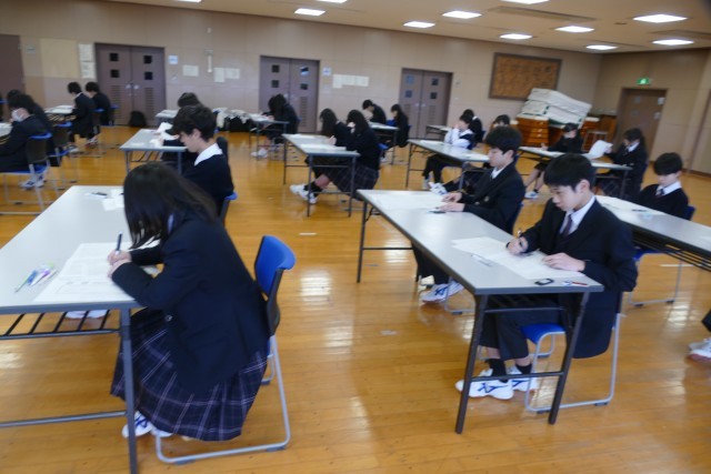 2月26日(木)学年末考査の2日目です。1年生は、国語、英語、音楽の3教科です。1年生のあるクラスの様子です。エアコンが故障して、多目的室でテストを受けています。環境が変わっても、生徒の皆さんはまじめに問題を解いています。素晴らしいです。頑張ってください。応援しています。