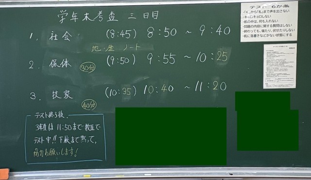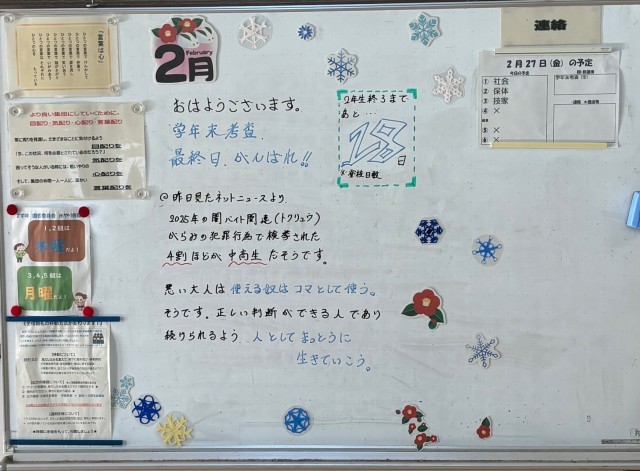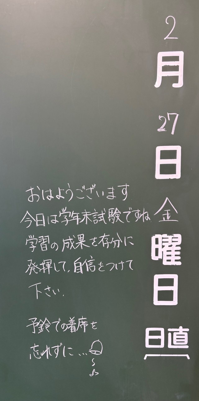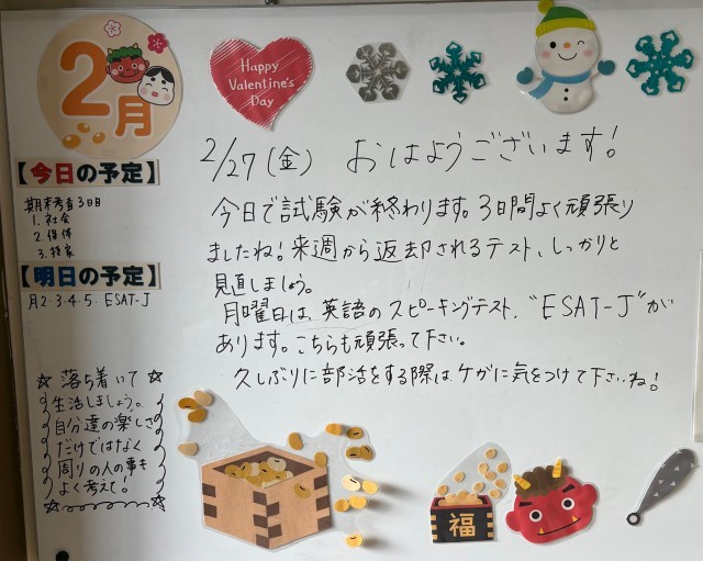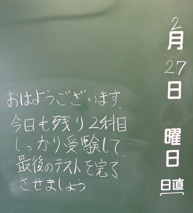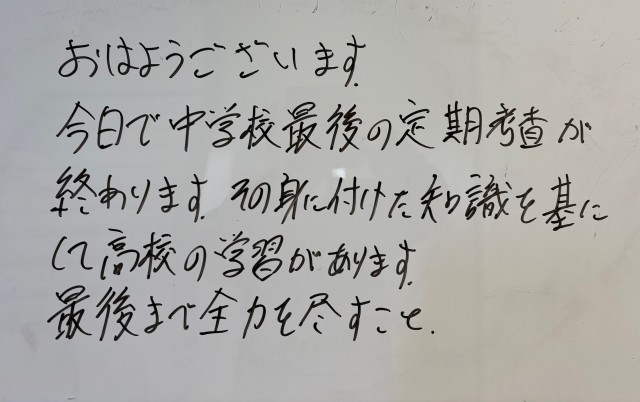 2月27日(金)の朝に校舎内を巡回していたら、学年主任や学級担任の先生からのメッセージが書いてありました。また、早めに登校して、教室で勉強している生徒もいました。素晴らしいです。