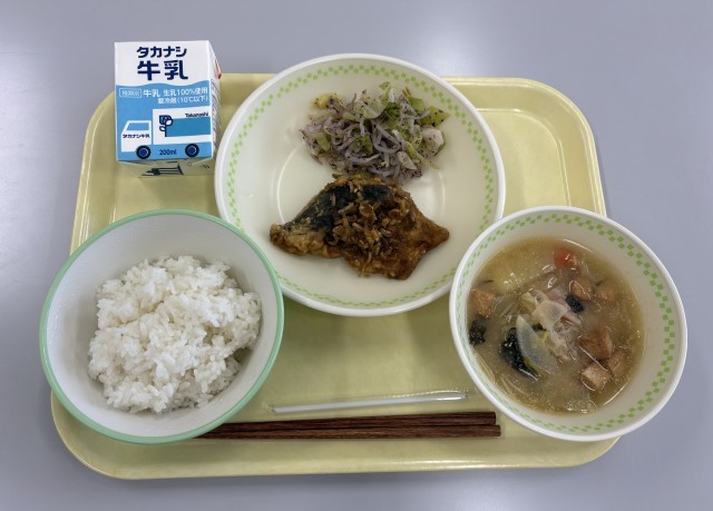 今日の給食のメニューは、ごはん、牛乳、あじの南蛮漬け、キャベツのゆかり和え、野菜と生揚げのすりごまみそ汁です。野菜と生揚げのすりごまみそ汁が温かくてとても美味しかったです。