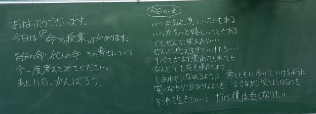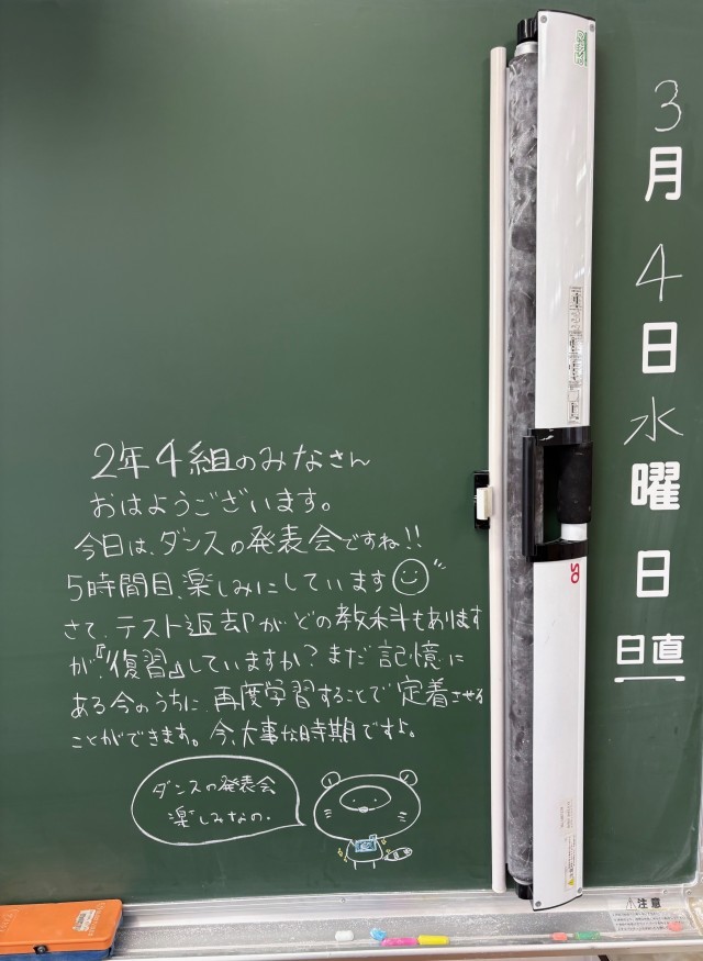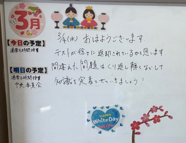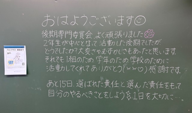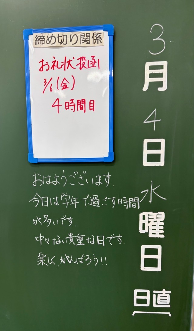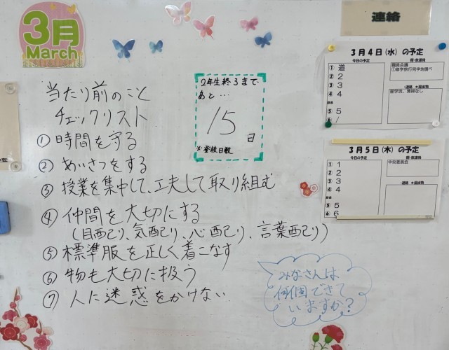 3月4日(水)の朝に校舎内を巡回していたら、学年主任や学級担任の先生からのメッセージが書いてありました。