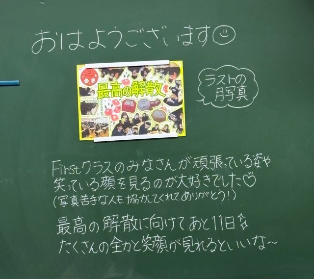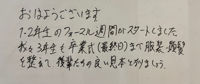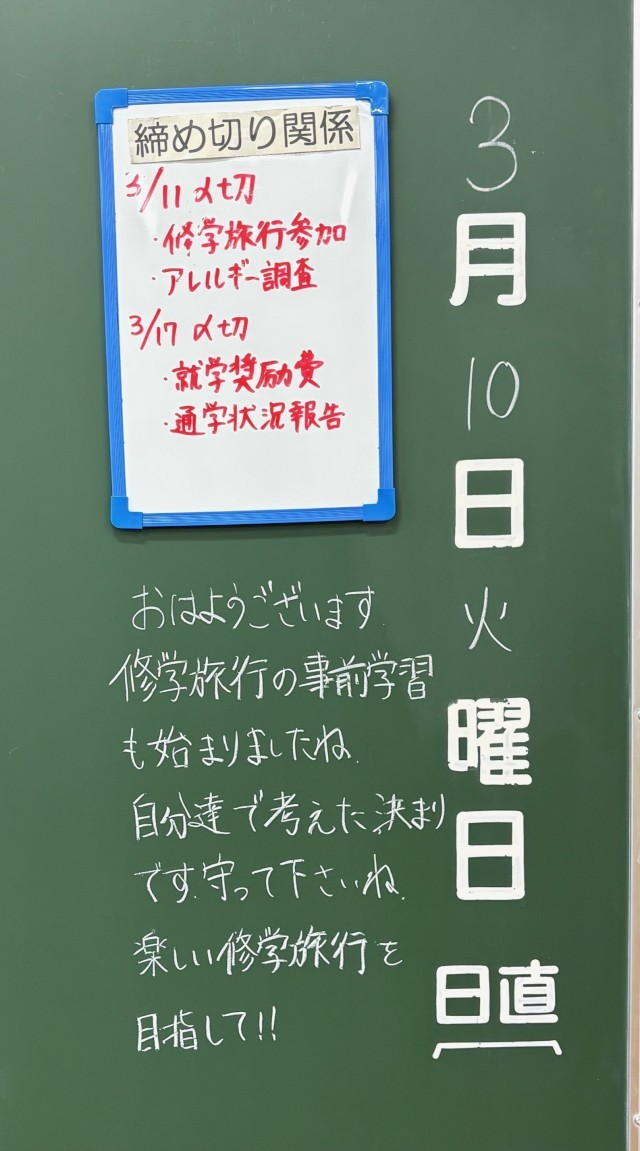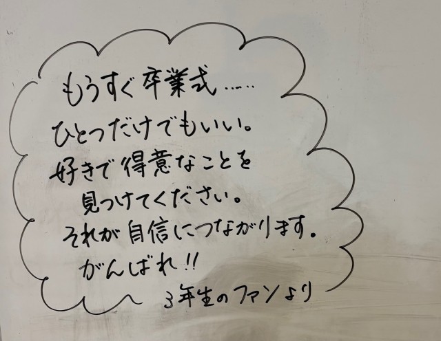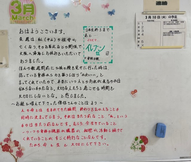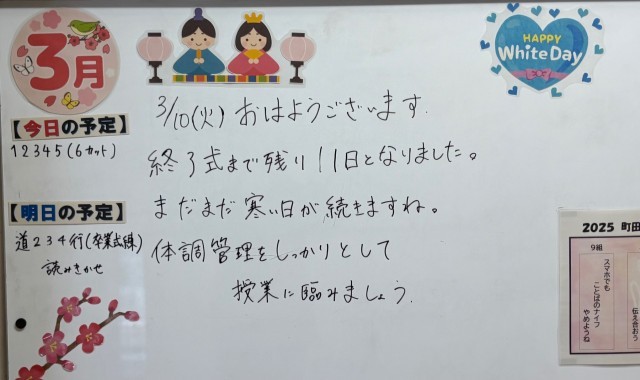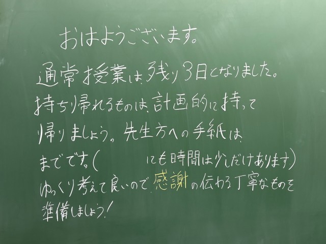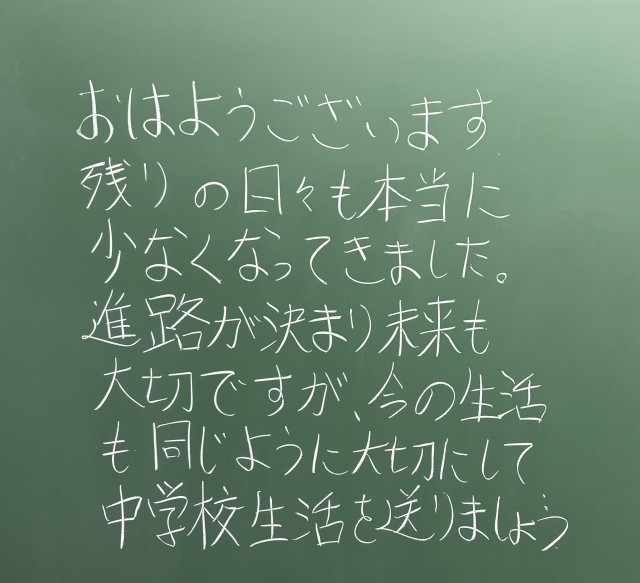 3月10日(火)の朝に校舎内を巡回していたら、学年主任や学級担任の先生からのメッセージが書いてありました。