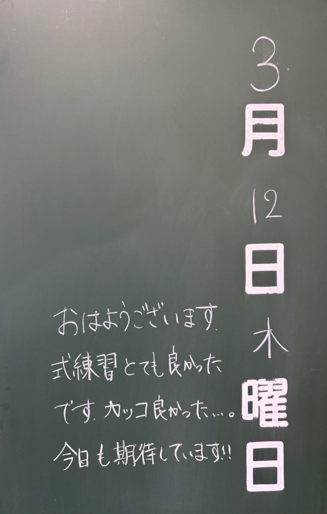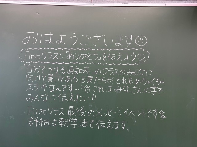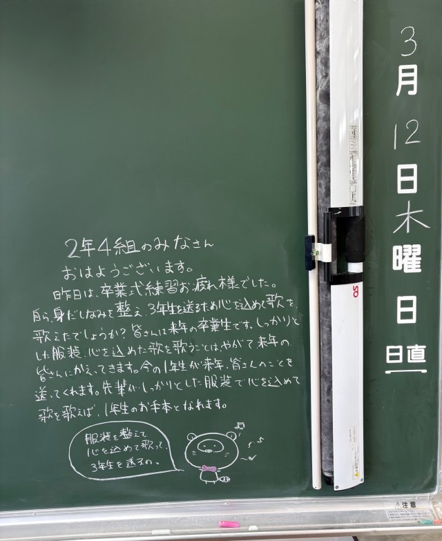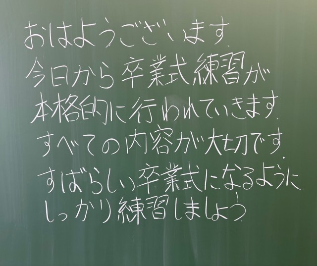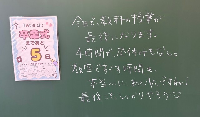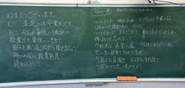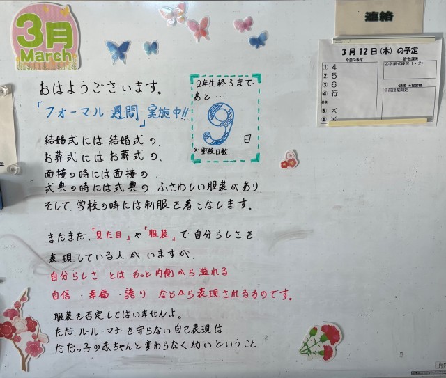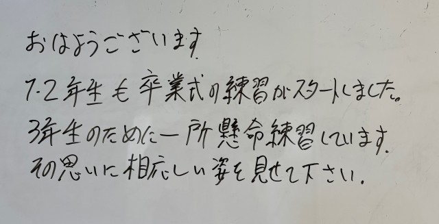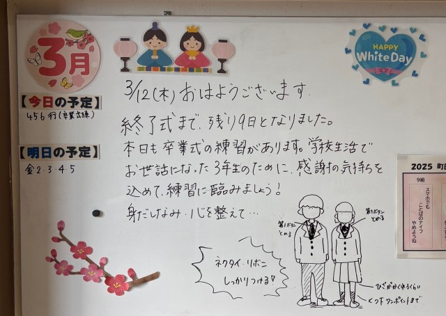 3月12日(木)の朝に校舎内を巡回していたら、学年主任や学級担任の先生からのメッセージが書いてありました。