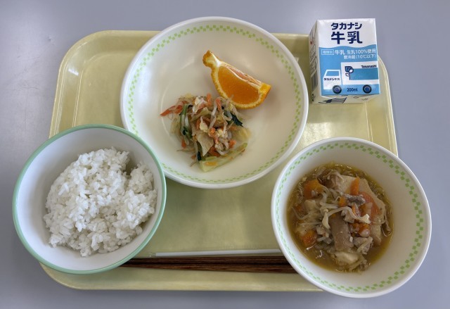 今日の給食のメニューは、すき焼き風煮、もやしとキャベツのからしみそ和え、ごはん、牛乳、柑橘(しらぬい)です。今日の給食もとても美味しかったです。ごちそうさまでした。
