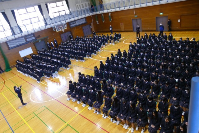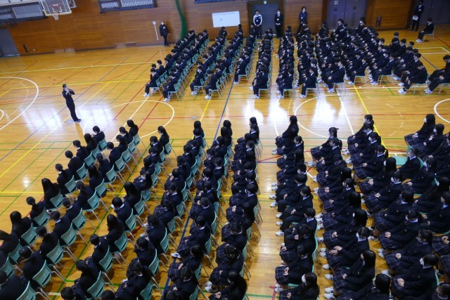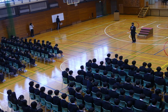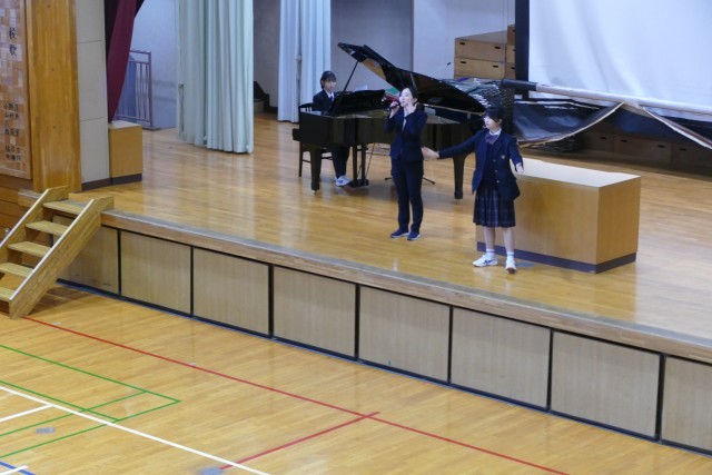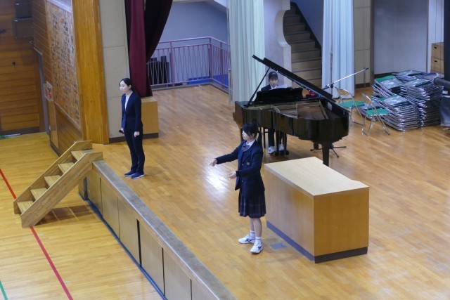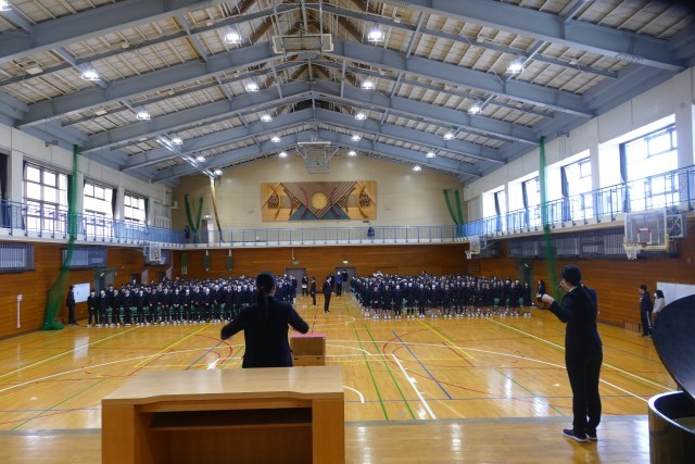 3月12日(木)4校時にアリーナで、1.2年生のみなさんが2回目の卒業式の練習を行いました。1回目の練習よりも格段に良くなりました。校歌や愛唱歌「未来へ届け」の合唱もとてもよくなりました。さすが忠生中生です。合唱の指導をした音楽科の廿楽先生や、2学年主任の中山先生、生活指導主任の小川先生もほめていました。この調子で、がんばってください。応援しています。