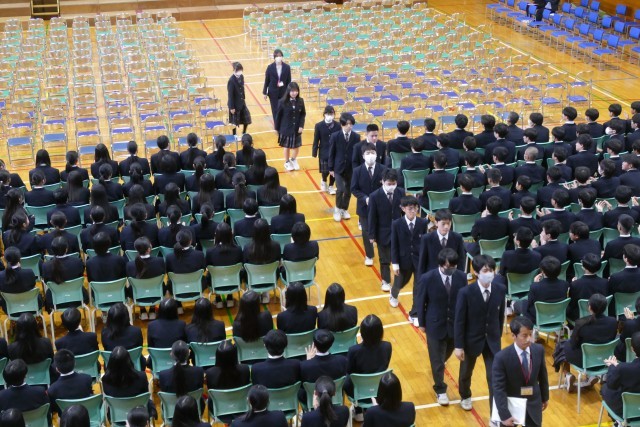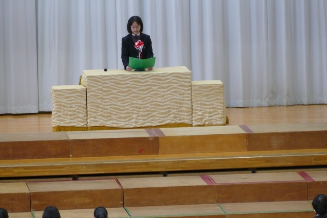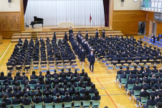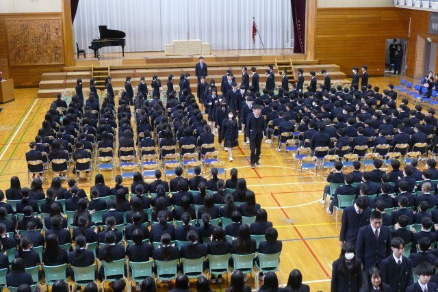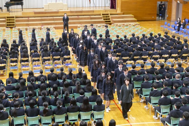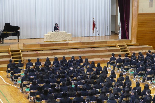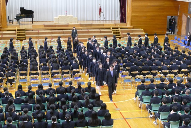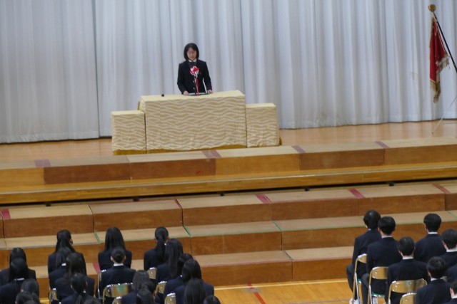 表彰の後に1年生の代表生徒のSさんが、3年生に向けて感謝の言葉を述べました。次に3年生の代表生徒のAさんが、在校生に向けてお別れのメッセージを送りました。お二人の代表生徒の言葉にはとても感動しました。素晴らしいです。最後に、3年生が退場します。在校生からは、3年生に対する感謝の拍手が鳴り響いています。