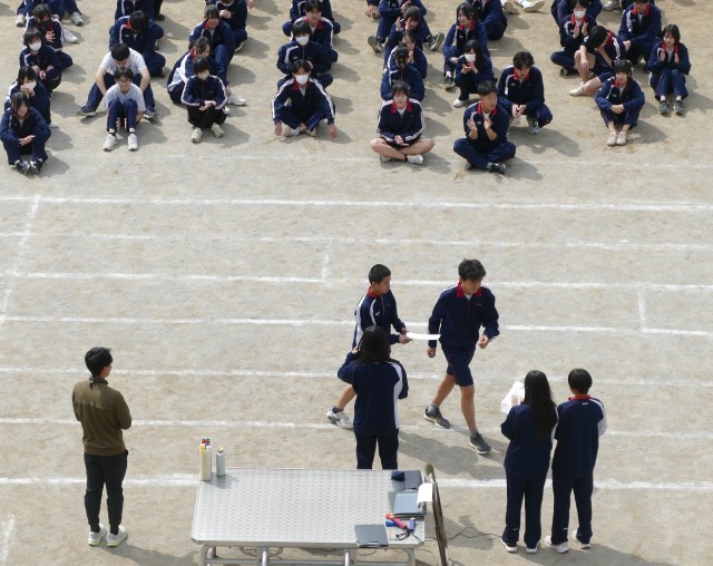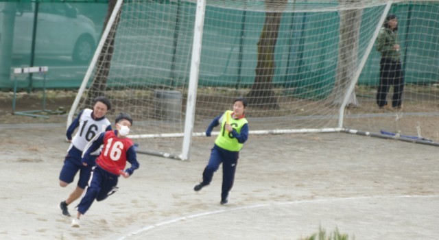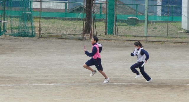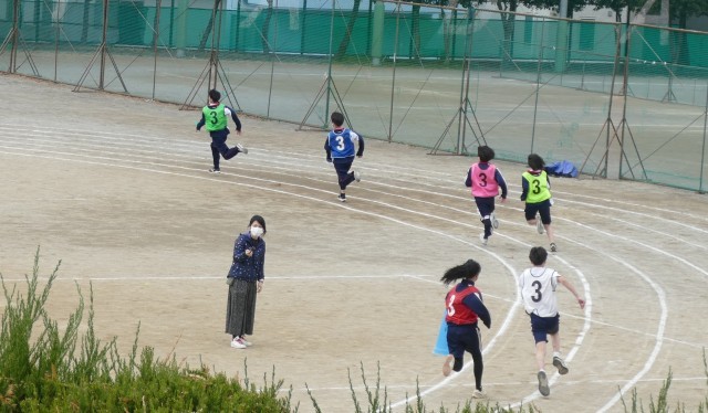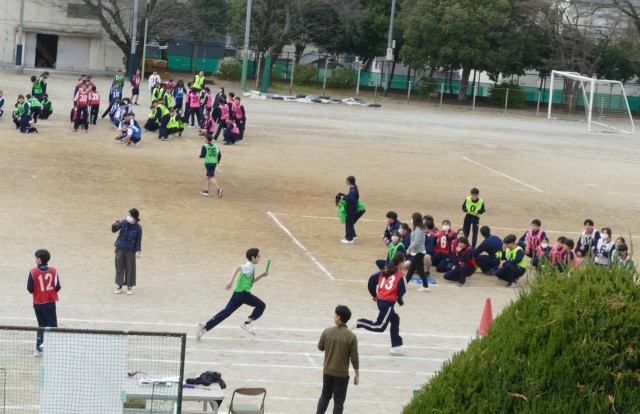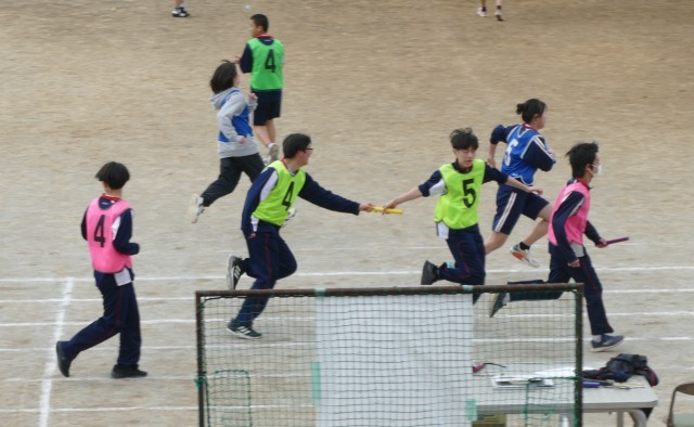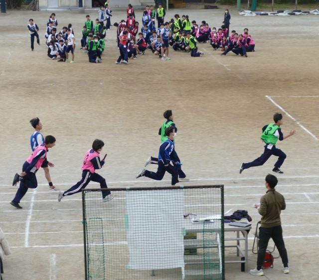 3年生のスポーツ大会の様子です。ドッジボールが終わり、クラス対抗の全員リレーです。担任の先生も走っています。みんな一生懸命です。
