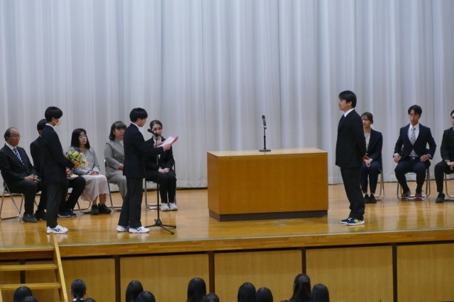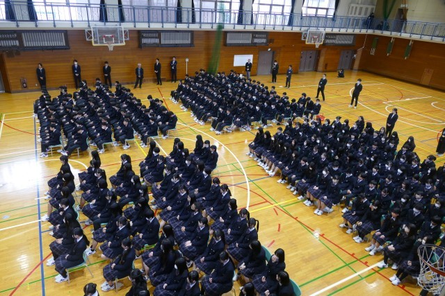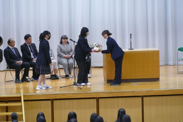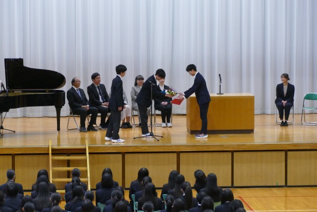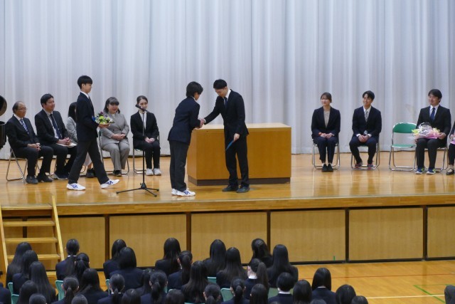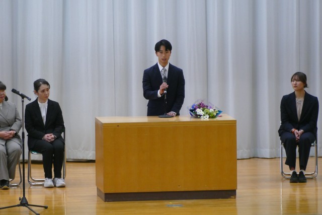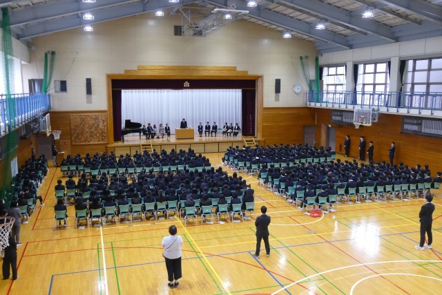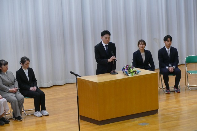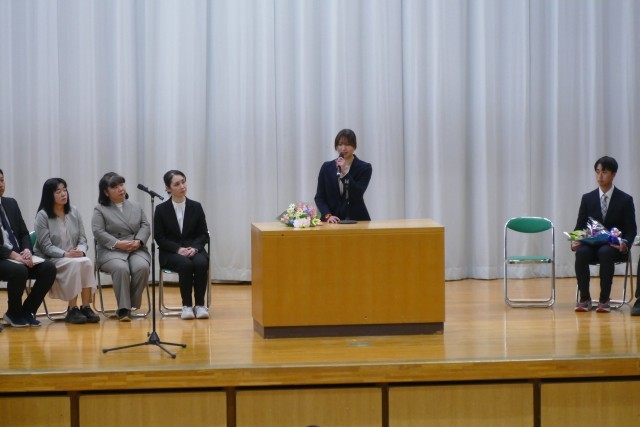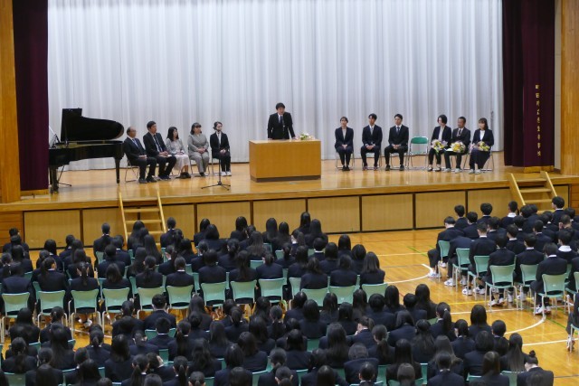 お別れする先生のお話を、生徒のみなさんは真剣に聞いています。離任する松原先生、石澤先生、片山先生、三橋先生からお別れのご挨拶がありました。
