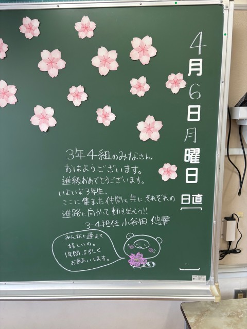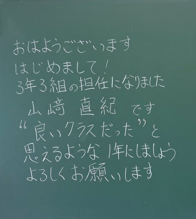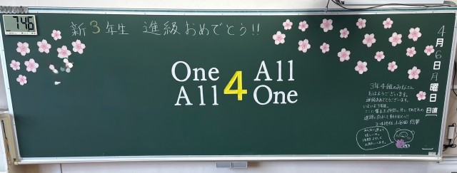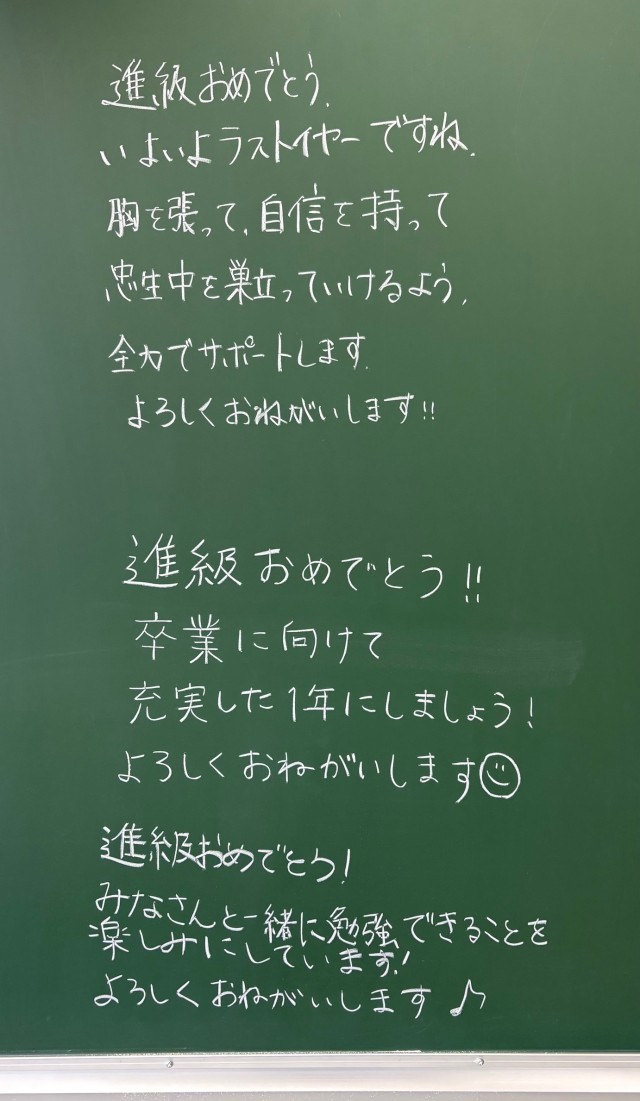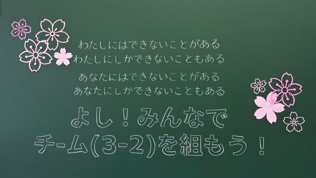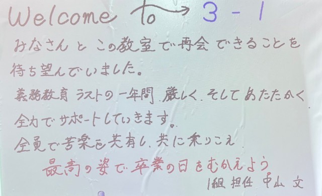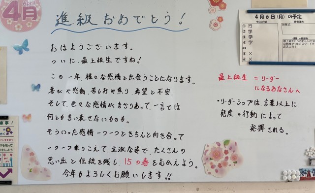 4月6日(月)の朝に校舎内を巡回していたら、3学年の学年主任や学級担任の先生からのメッセージが書いてありました。