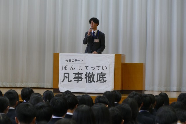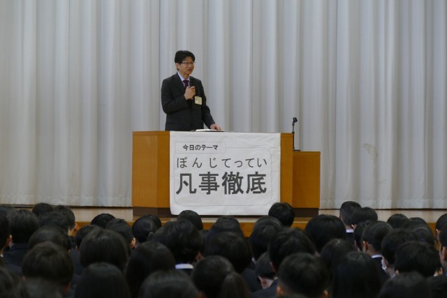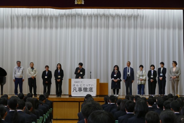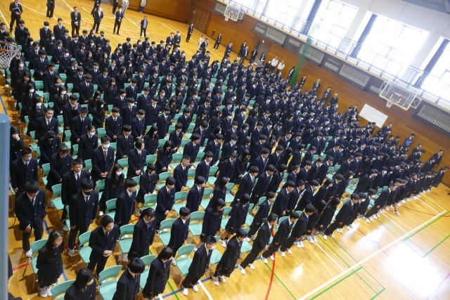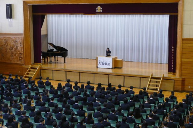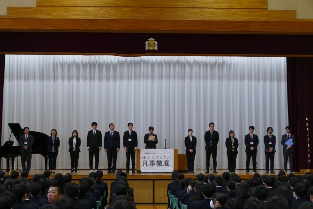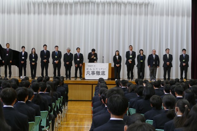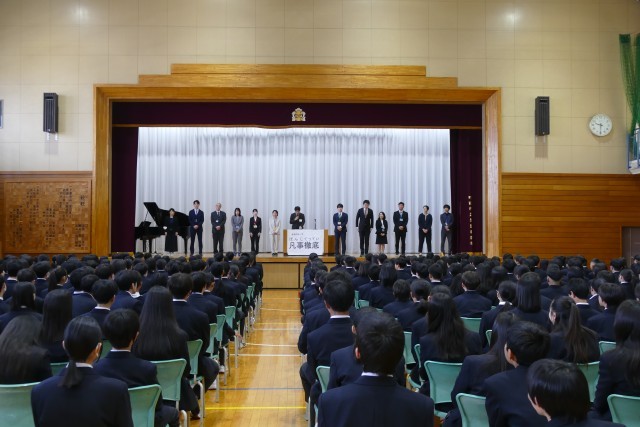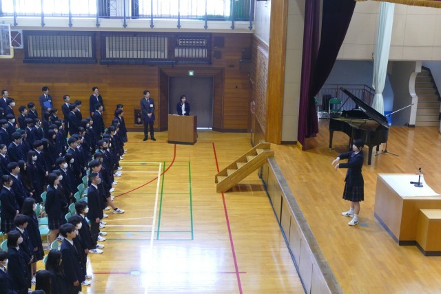 始業式を行いました。はじめに、校歌斉唱です。指揮はKさん、伴奏はSさんです。次に、校長先生から「凡事徹底」をテーマにお話がありました。続けて、各学年の学級担任や副担任、教職員の紹介がありました。そして、生活指導主任の蔀先生から「①基本的生活習慣を身に付ける、②授業規律を守る、③環境整備に努める」のお話がありました。最後に、生徒会本部役員のKさんから「充実した1学期にするために、授業や行事(合唱コンクール)などの学校生活に全力で取り組もう」と、お話ありました。進級した生徒の皆さんは、新年度への期待に胸をふくらませて、しっかりとした態度で式に臨んでいます。新3年生は忠生中の「顔」として、新2年生は「中堅学年」としての活躍を期待するとともに、よりよい忠生中づくりのために力を合わせて取り組んでいきましょう。