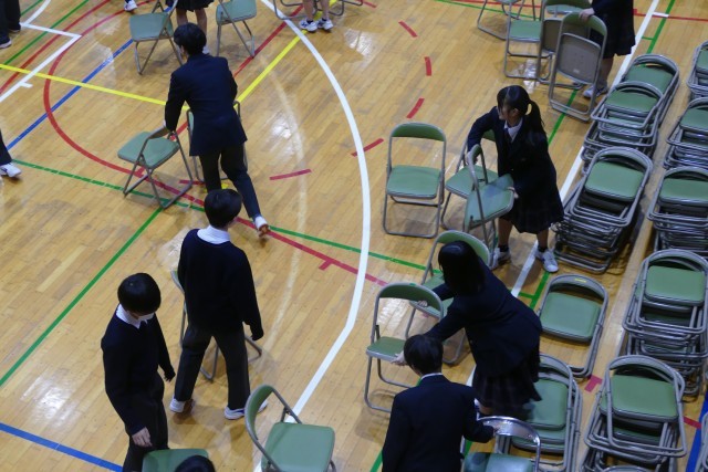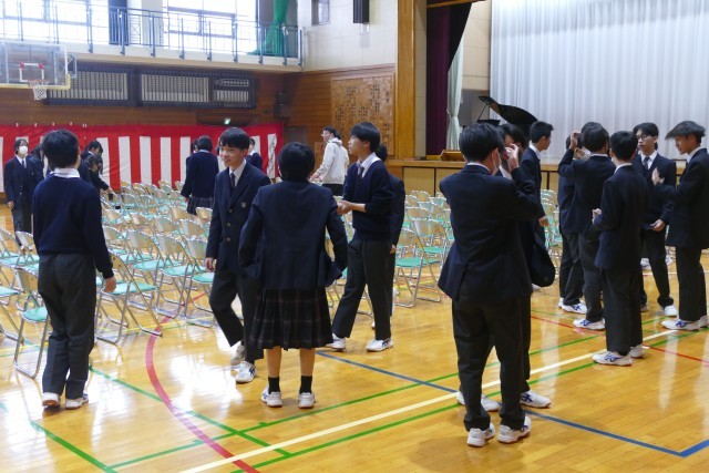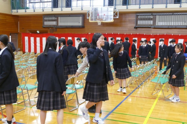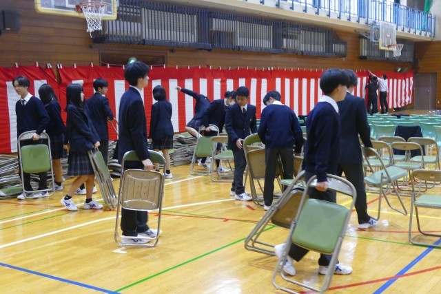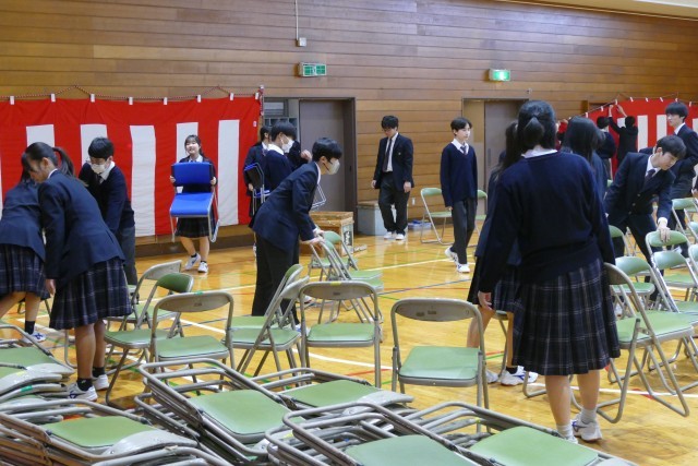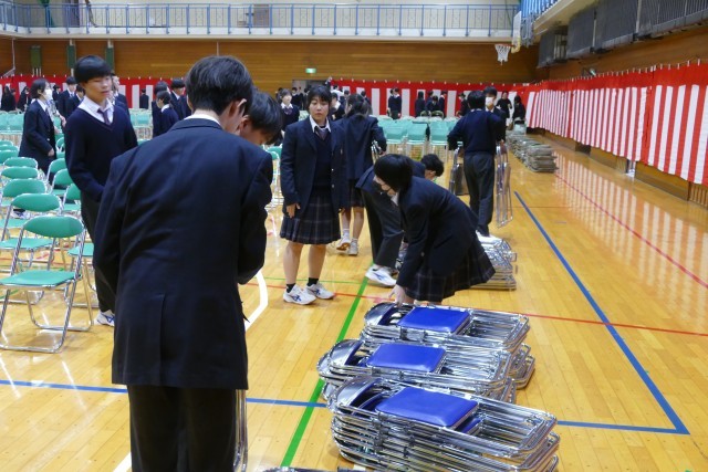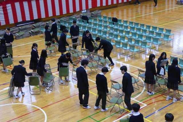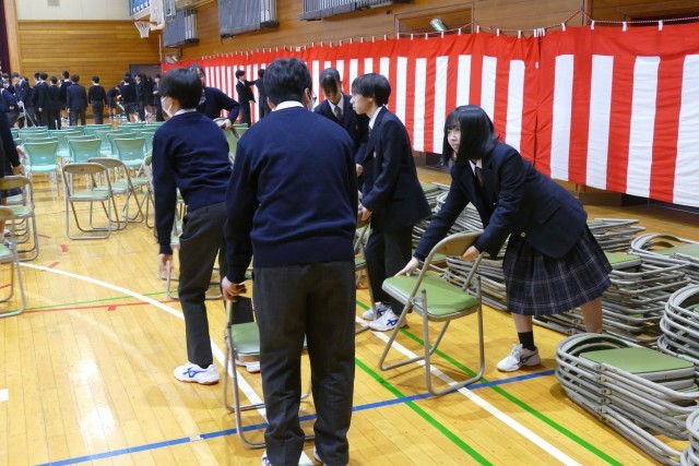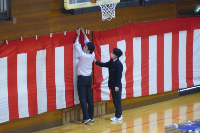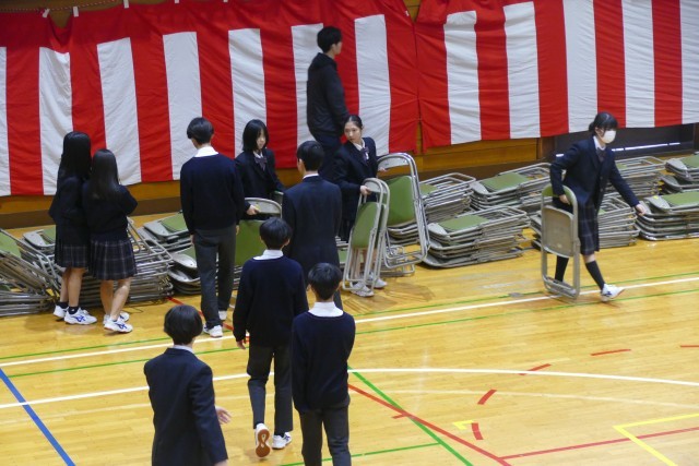 4月7日(火)4校時にアリーナで3年生のみなさんが紅白幕を設置したり、パイプ椅子を並べるなど、会場準備をしています。一人一人が積極的に仕事に取り組んでいます。素晴らしいです。