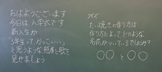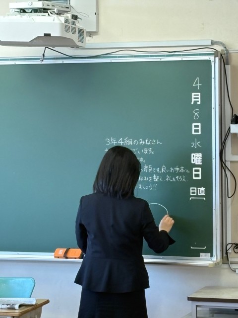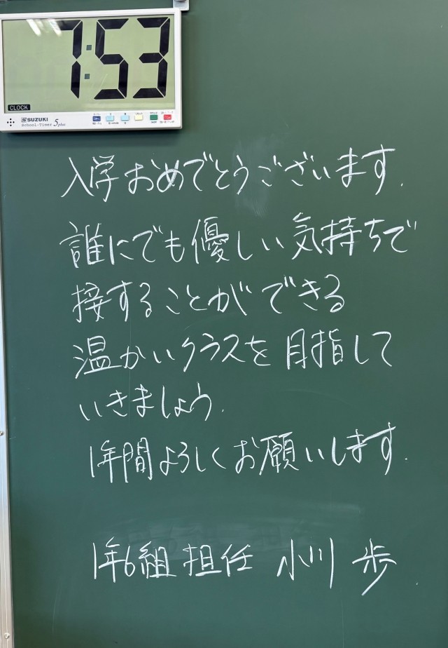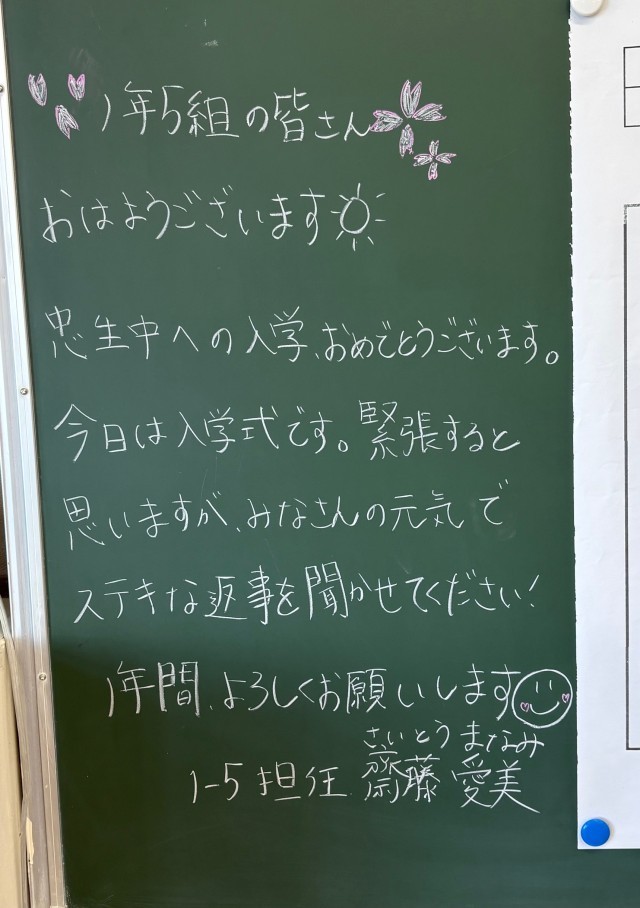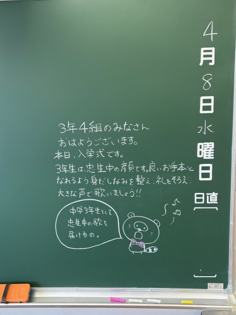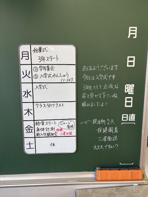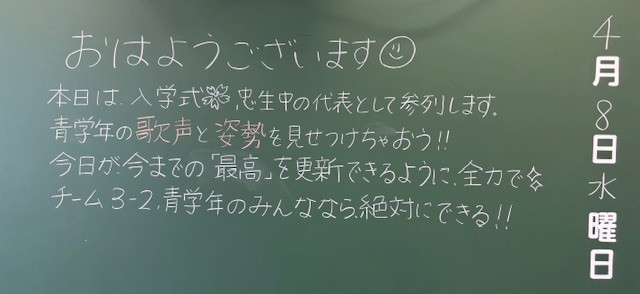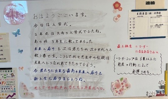4月8日(水)の朝に校舎内を巡回していたら、学年主任や学級担任の先生からのメッセージが書いてありました。