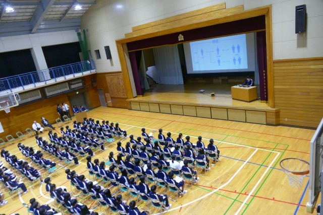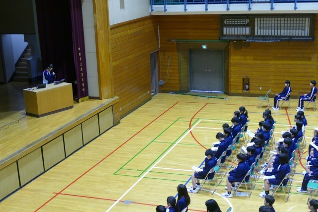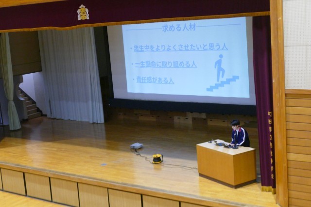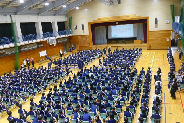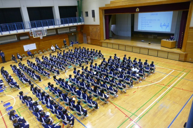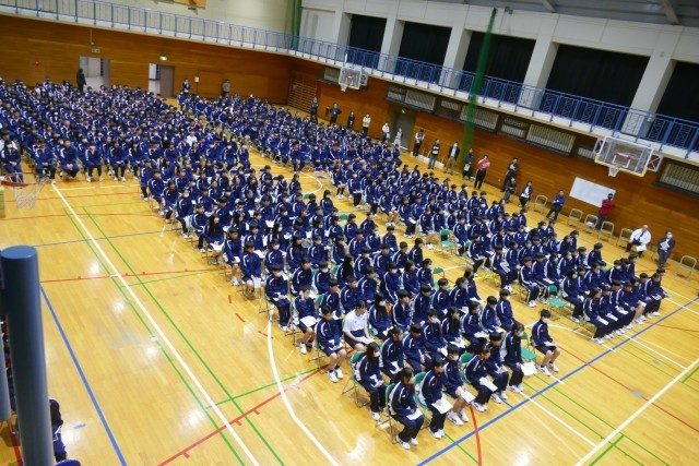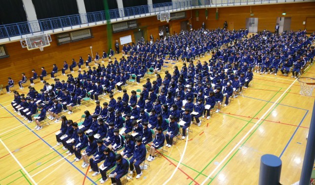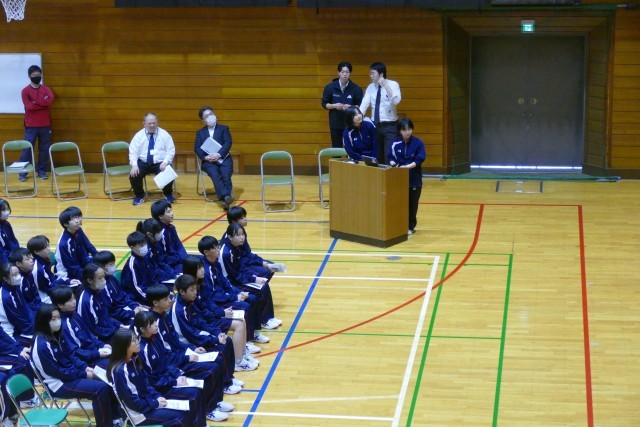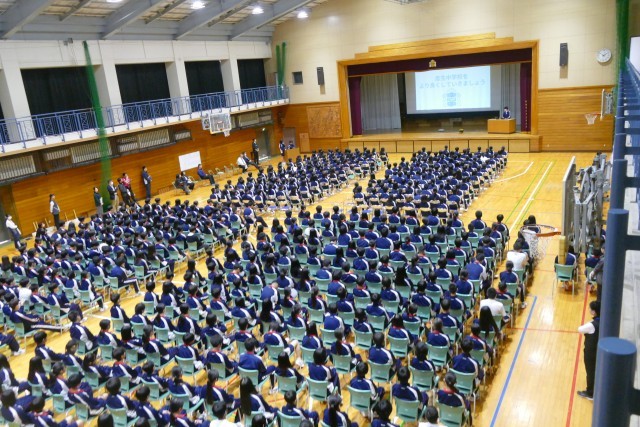 4月10日(金)午後1時45分からアリーナで新入生歓迎会を行いました。新入生が入場すると2・3年生が温かい拍手を送っています。はじめに生徒会と各委員会のお話がありました。1年生の皆さんは、先輩方のお話を真剣に聞いています。とても立派です。