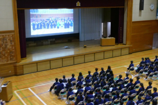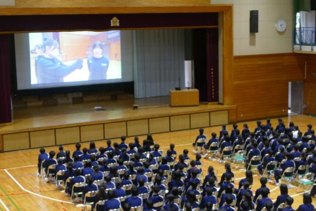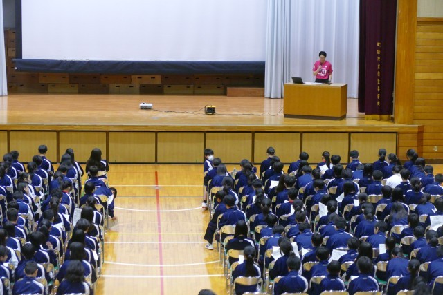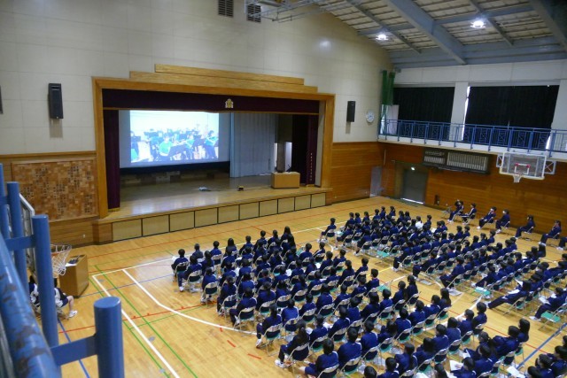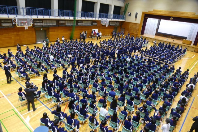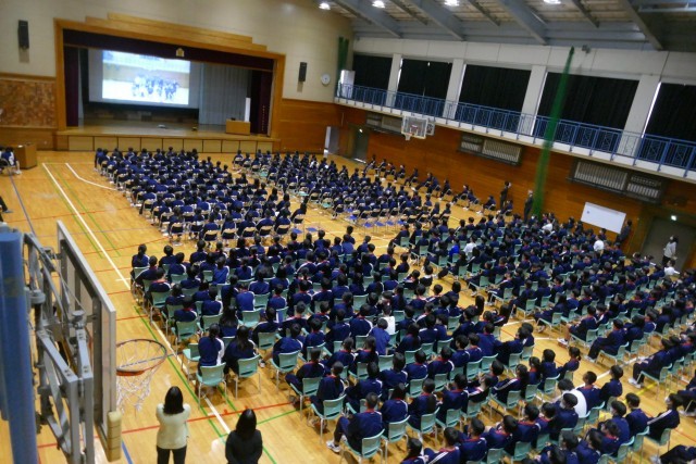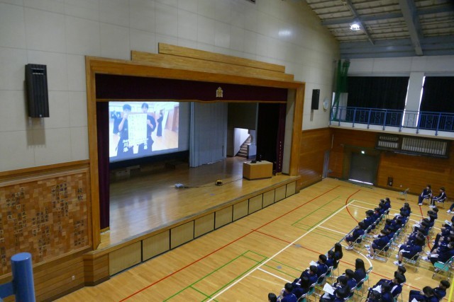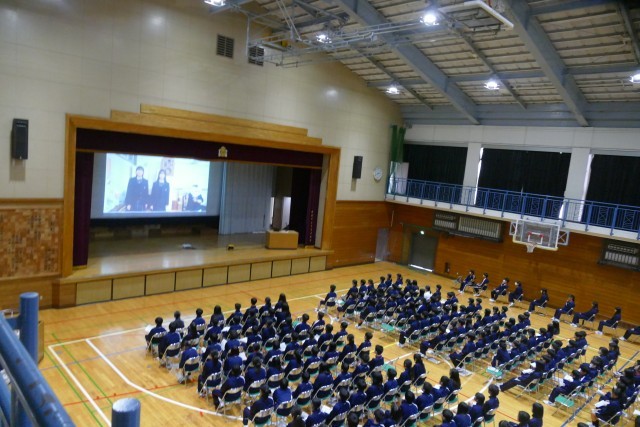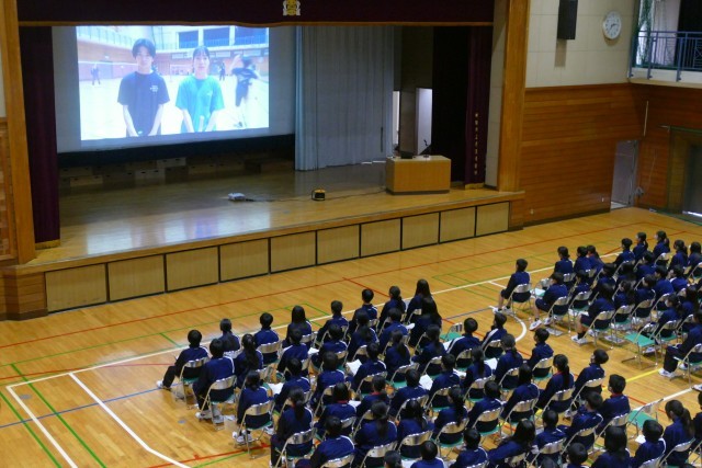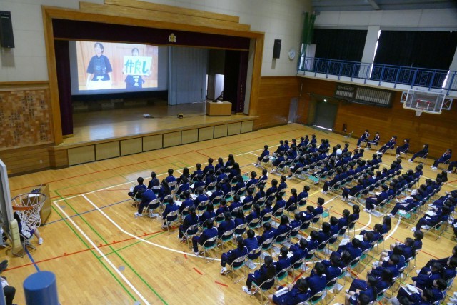 動画による部活動の紹介がありました。先輩方が生き生きと部活動の紹介をしています。最後に部活動担当の森先生からお話がありました。1年生の皆さんは最後まで集中してお話を聞いていました。新入生が退場するときも、先輩方が温かい大きな拍手を送っています。素晴らしいです。