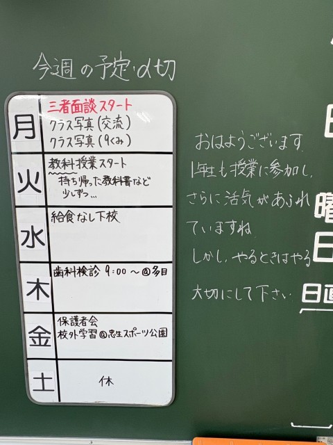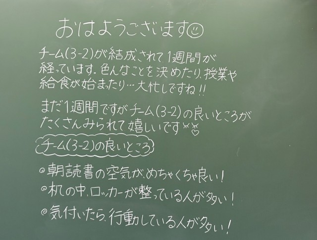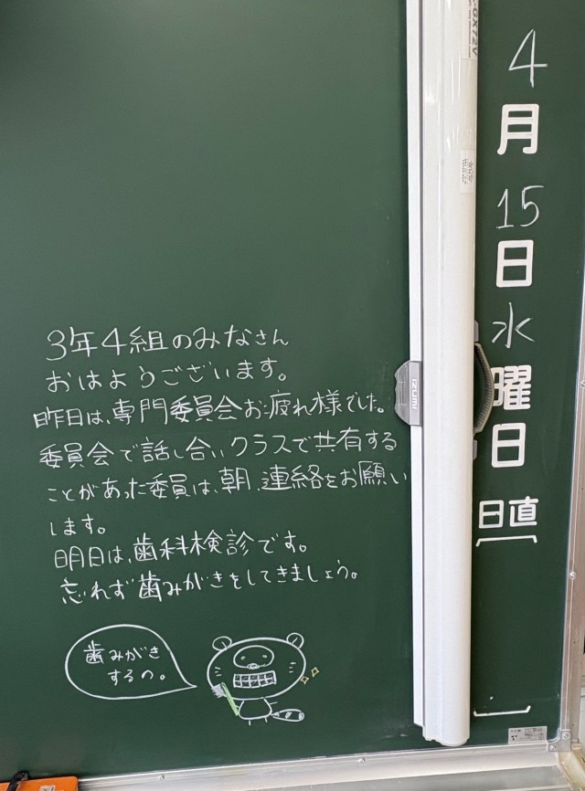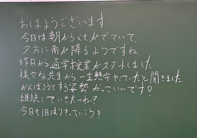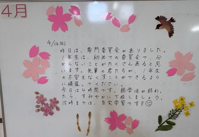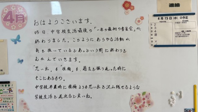4月15日(水)の朝に校舎内を巡回していたら、学年主任や学級担任の先生からのメッセージが書いてありました。