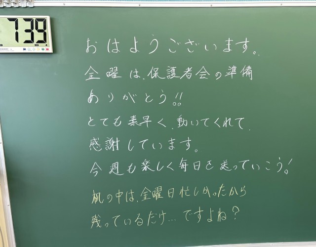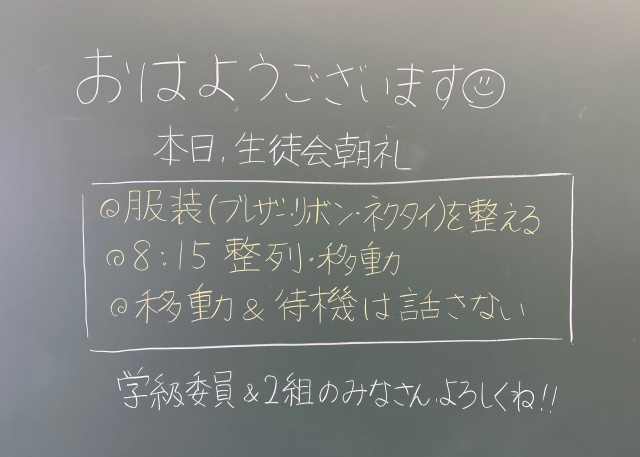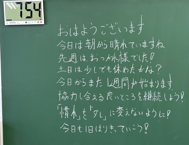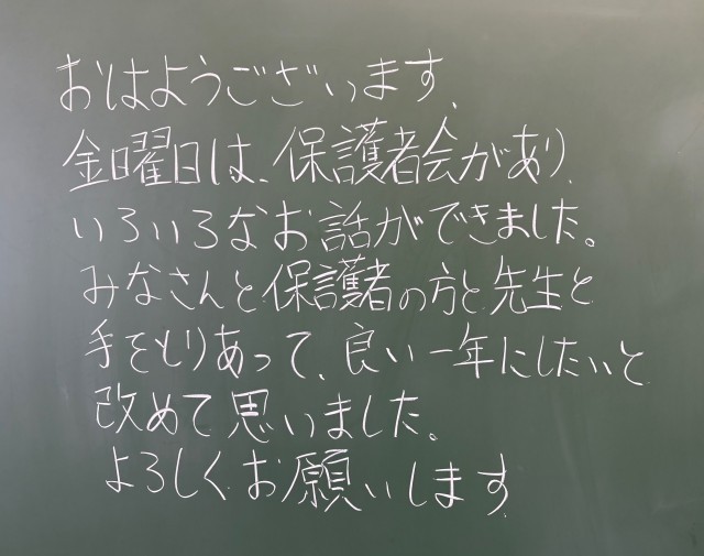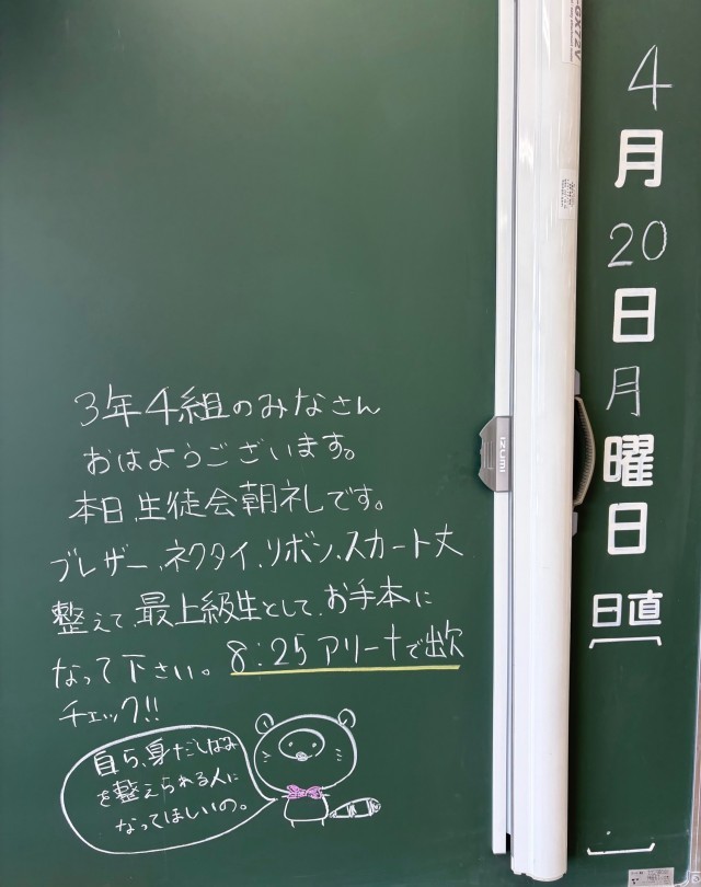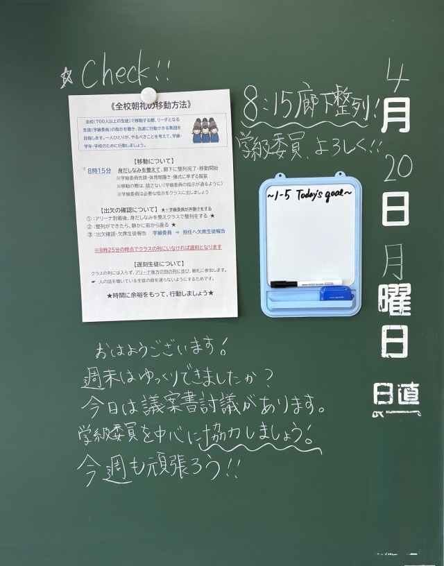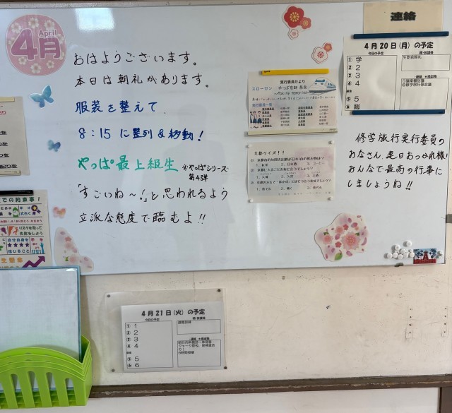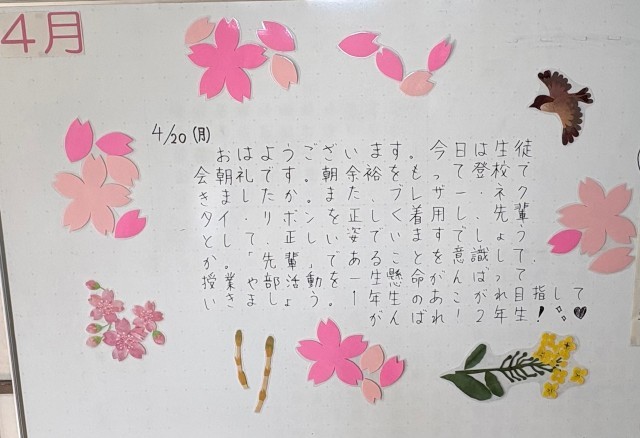 4月20日(月)の朝に校舎内を巡回していたら、学年主任や学級担任の先生からのメッセージが書いてありました。