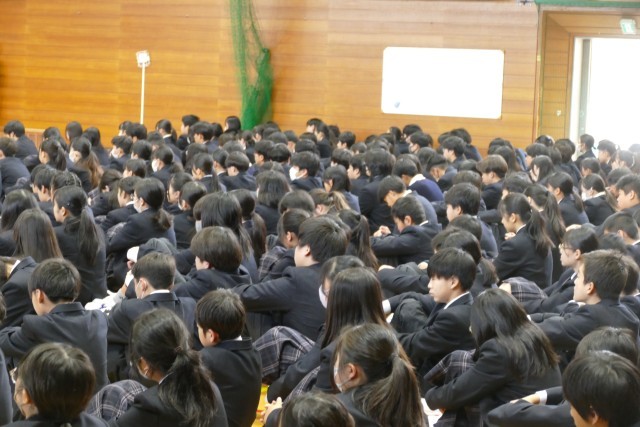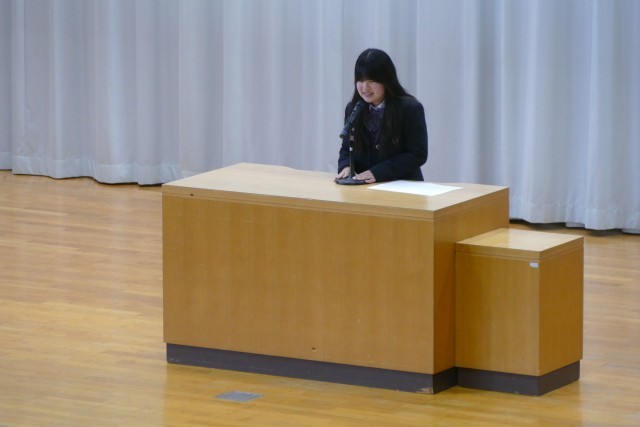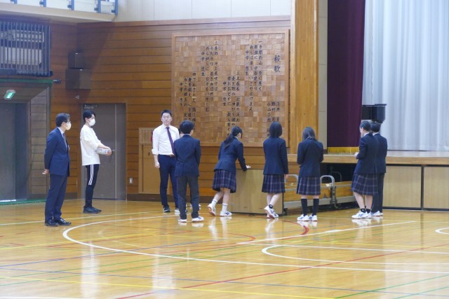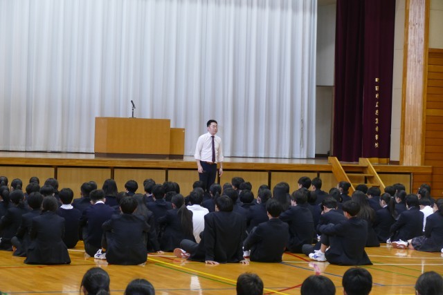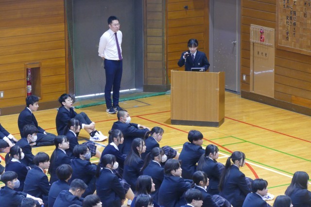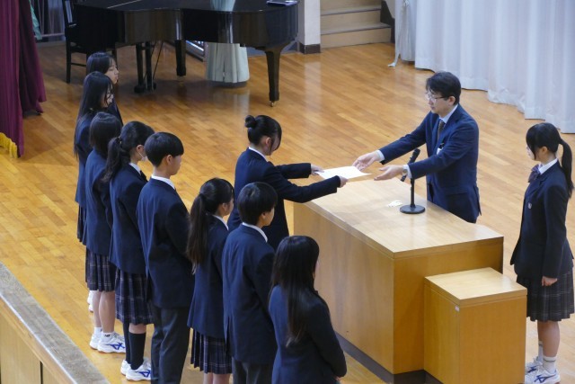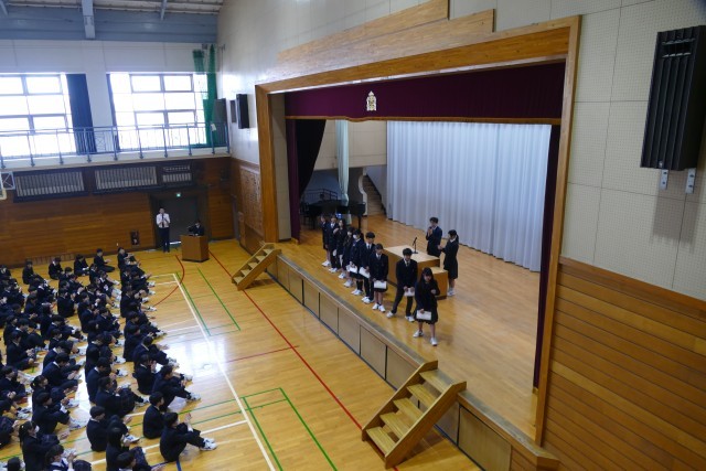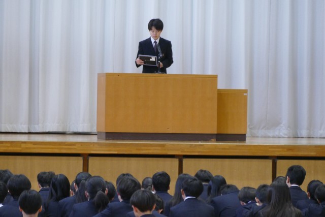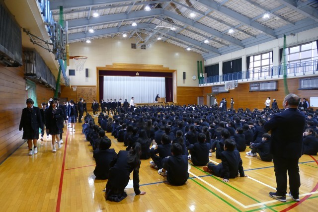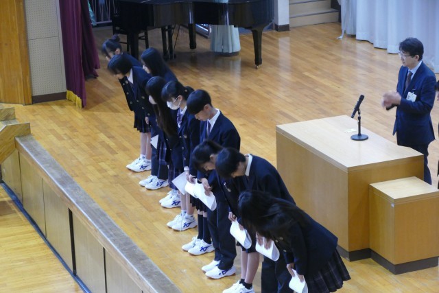 4月20日(月)8時25分からアリーナで生徒会朝礼を行いました。生徒会本部役員のYさんが司会をしています。はじめに各種専門委員会の委員長の任命式が行われました。校長先生から、一人一人に任命書が手渡されました。次に3学年の学年委員長のYさんから、「3年生がリーダシップをとり、下級生のお手本になるように引っ張っていきましょう!」と力強いあいさつがありました。そして、生徒会長のKさんから、「TPOに応じた制服の着こなしをしっかりやっていきましょう!」との呼びかけがありました。生徒の皆さんは、よくお話を聞いています。とても立派です。最後に、生徒会担当の鈴木鷹斗先生から、礼法のお話がありました。全校生徒の皆さんがアリーナから退場しているときに、生徒会本部役員のみなさんが率先して、演台や階段を片付けていました。当たり前のことを当たり前に取り組む本部役員の皆さんは「凡事徹底」が身に付いていて、素晴らしいです。