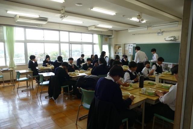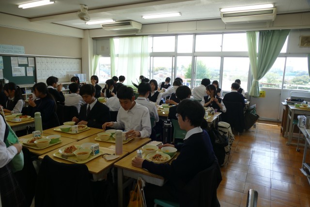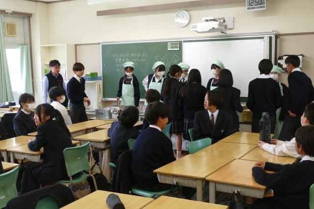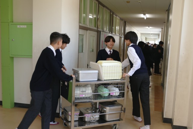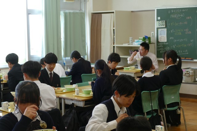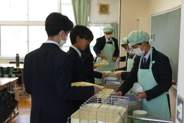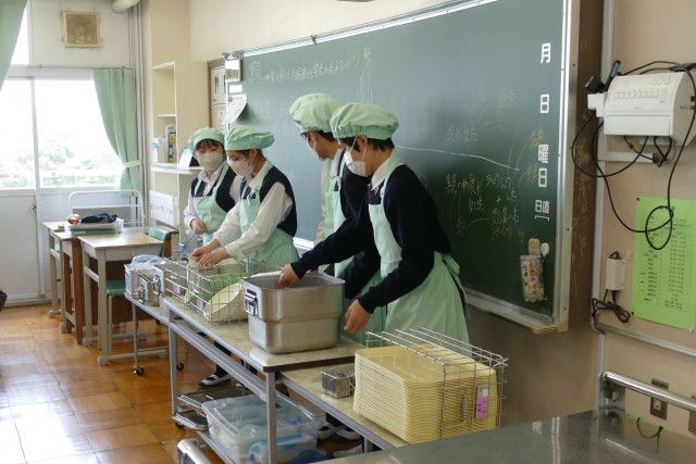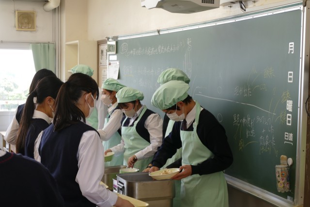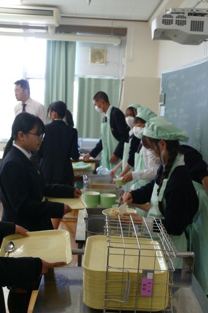 4月20日(月)の給食の様子です。生徒の皆さんは協力して給食の準備をしています。班で仲良く美味しい給食を食べていました。
