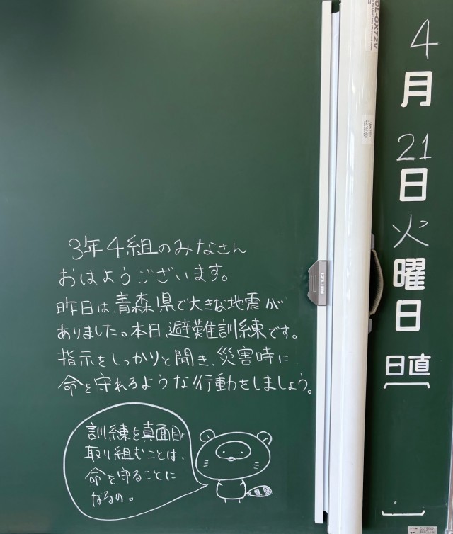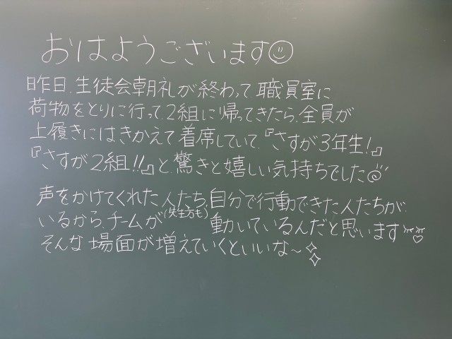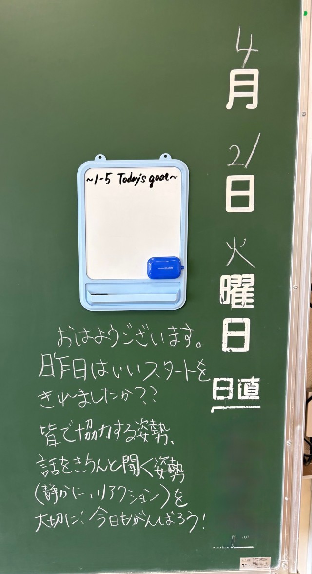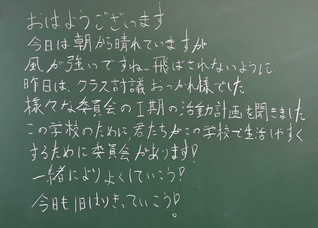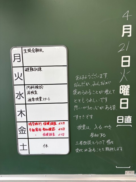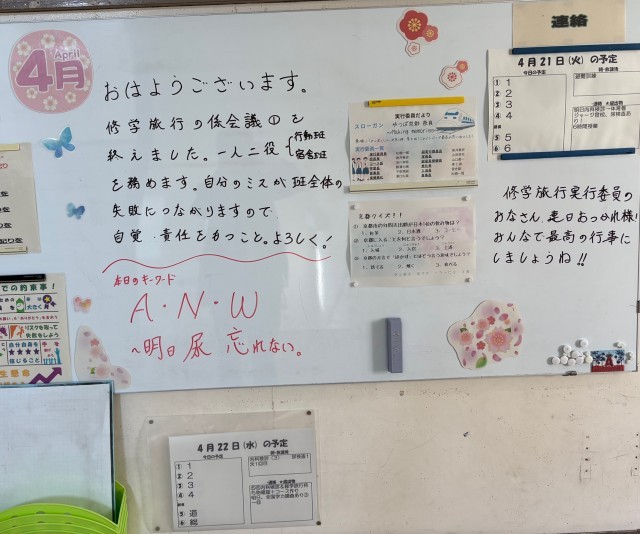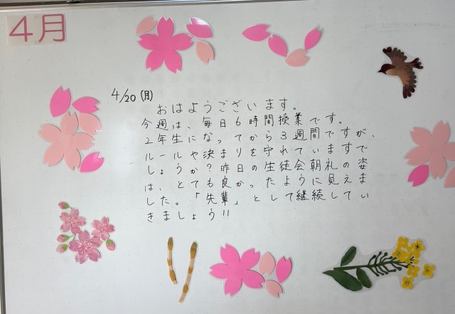 4月21日(火)の朝に校舎内を巡回していたら、学年主任や学級担任の先生からのメッセージが書いてありました。
