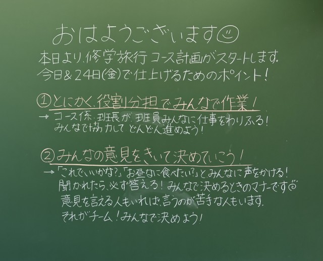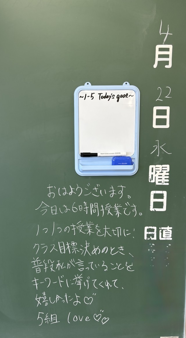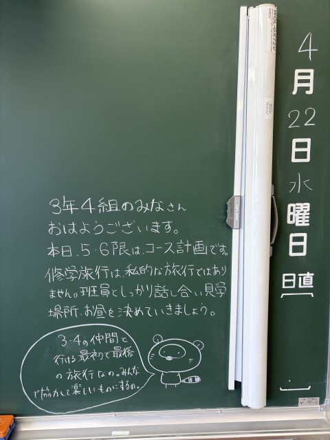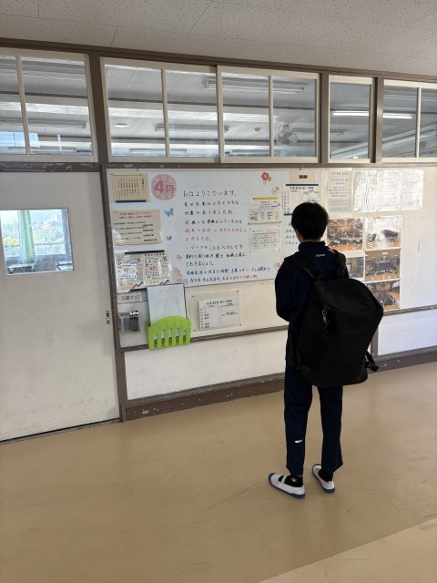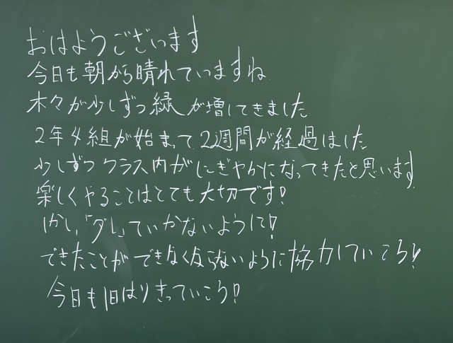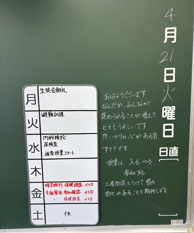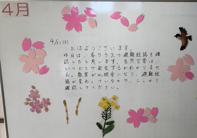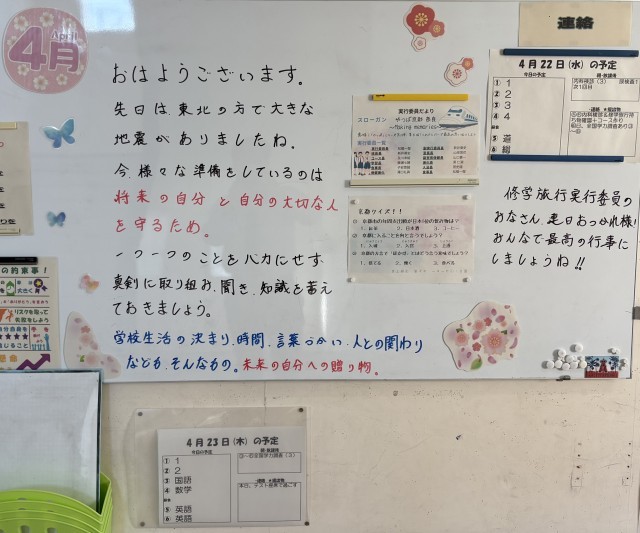 4月22日(水)の朝に校舎を巡回していたら、学年主任や学級担任の先生からのメッセージが書いてありました。