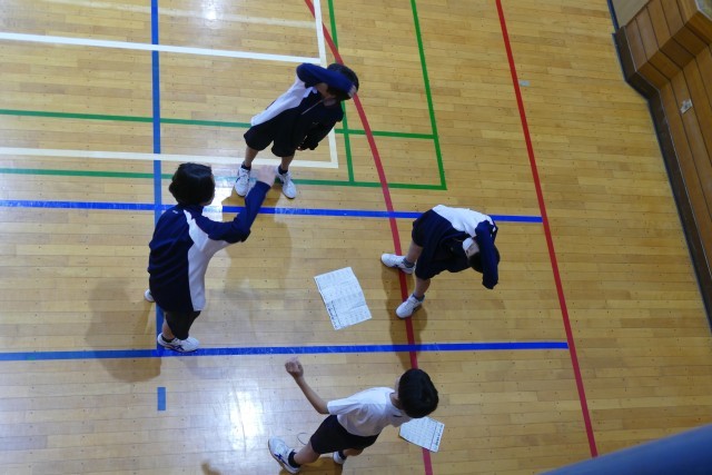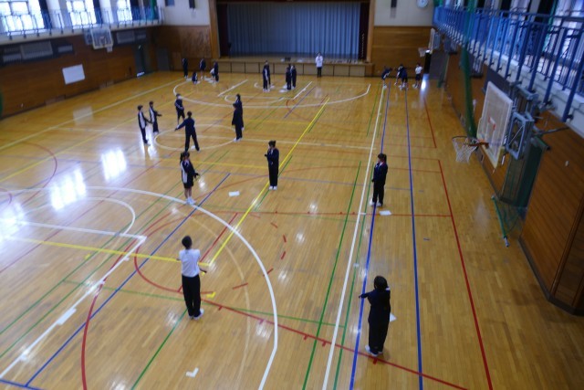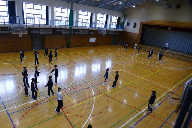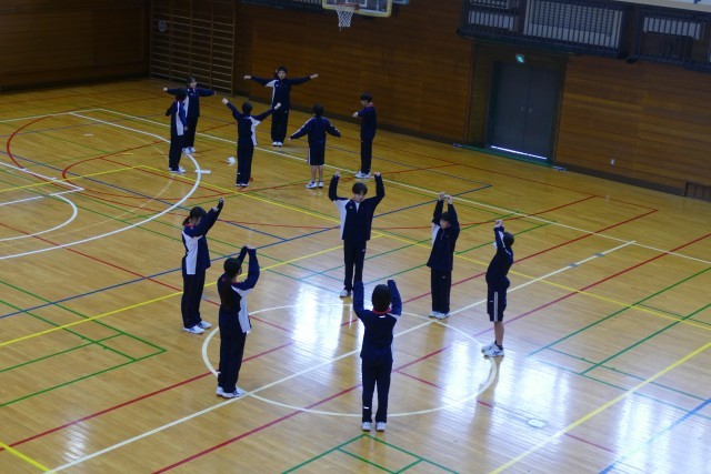 4月22日(水)4校時にアリーナで、武林先生の体育の授業が行われていました。2年生のみなさんがグループに分かれて「ラジオ体操」の練習をしていました。2年生のみなさんは武林先生のご指導のもと、グループで話し合って授業に取り組んでいました。