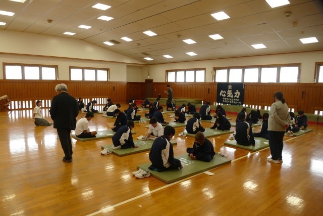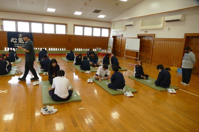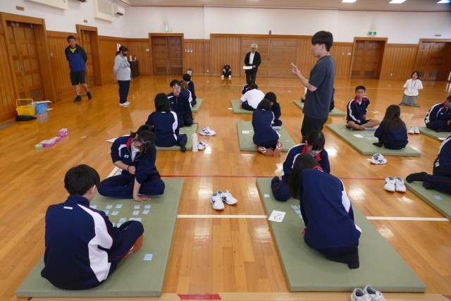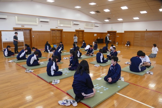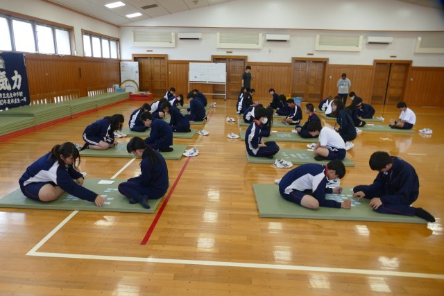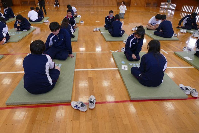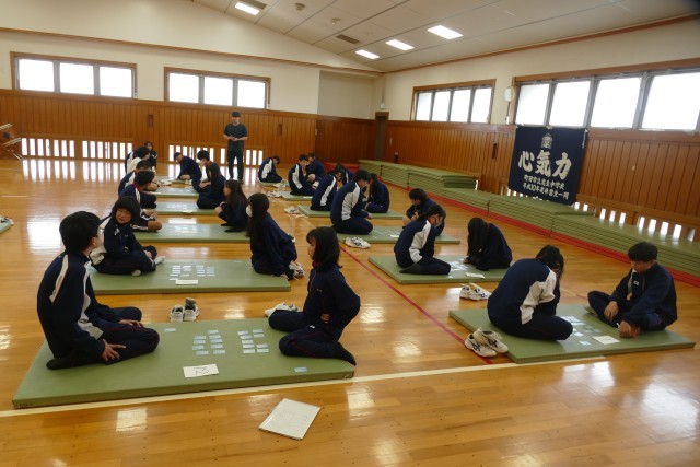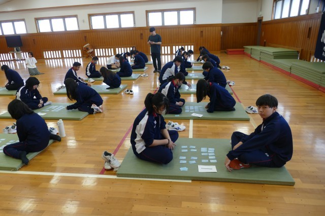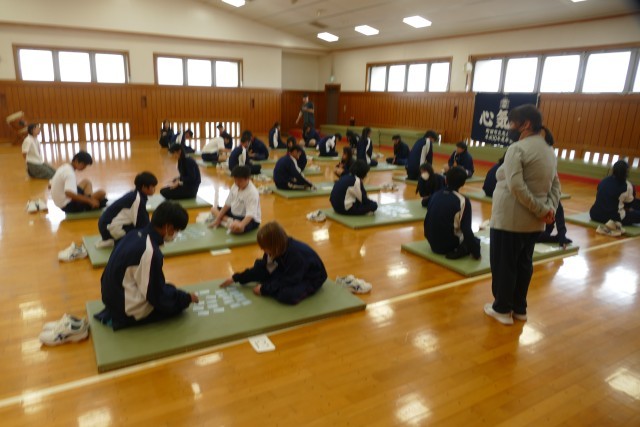 4月22日(水)4校時に格技室で、9組の生徒のみなさんが「百人一首」をしていました。とても仲良く楽しく取り組んでいました。