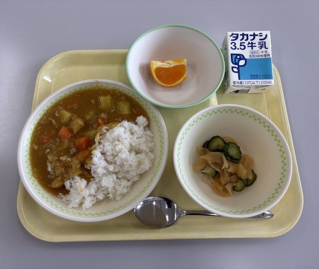 今日の給食のメニューは、チキンカレーライス、牛乳、手作り福神漬け、柑橘(清見オレンジ)です。今日の給食もとても美味しかったです。ご馳走様でした。