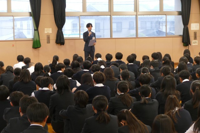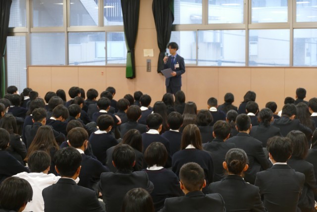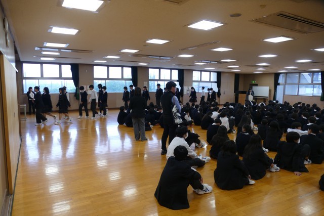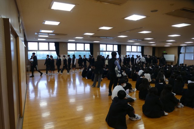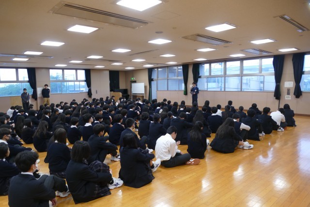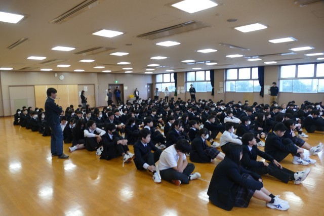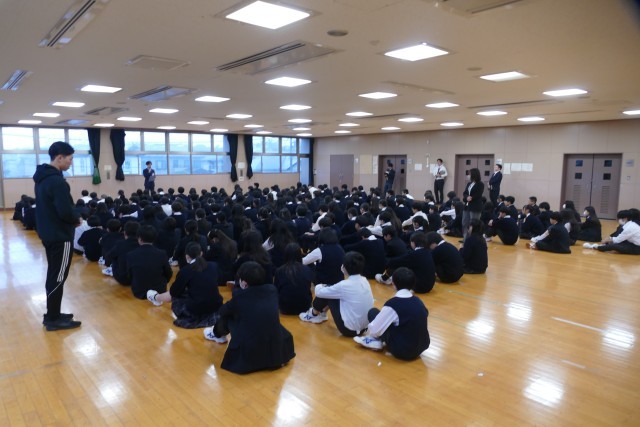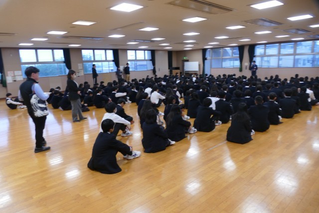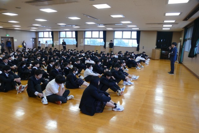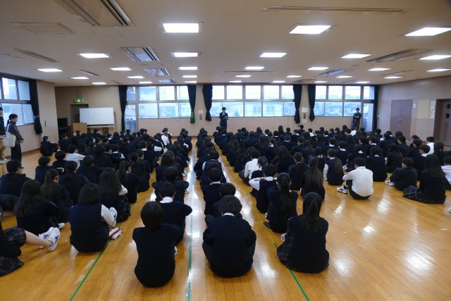 4月27日(月)午前8時45分から多目的室で2年生のみなさんが学年集会を行いました。現在、2学年ではいろいろなことが起きています。それらについて一度振り返り、また前を向いてみんなで協力してよい学年にするために、学年主任の蔀先生がお話ししました。「①目くばせ、②ひそひそ話、③聞えよがし、④隠語は絶対にしない!」とのお話でした。生徒のみなさんは、自分事としてお話を聞いていました。みんなで協力して、やさしい思いやりのある学年をつくってほしいと思います。