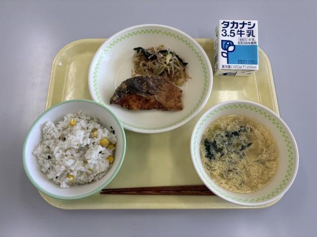 4月27日(月)の給食 公開日 2026/04/27 更新日 2026/04/27 今日の給食 今日の給食のメニューは、とうもろこし入り菜めし、牛乳、ますの竜田揚げ、梅肉和え、かきたま汁です。今日の給食もとても美味しかったです。ご馳走様でした。