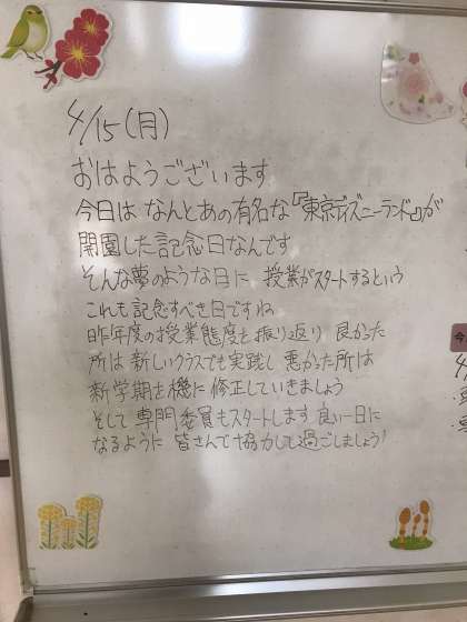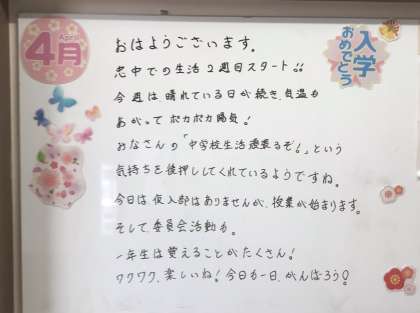 4月15日(月)の朝に校内を巡回していたら、1・2年生フロアーの廊下に学年主任の先生から生徒の皆さんへのメッセージが書いてありました。