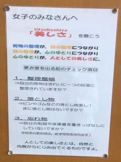 更衣室には、生徒の皆さんへのお願いのメッセージが貼ってありました。