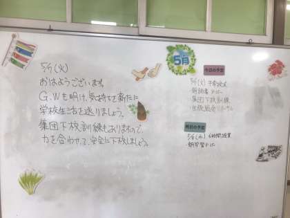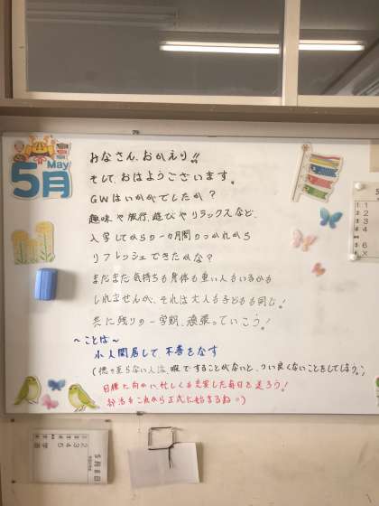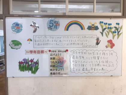 5月7日(火)に校内を巡回していたら、各学年のフロアーに学年主任の先生から生徒の皆さんへのメッセージが書いてありました。