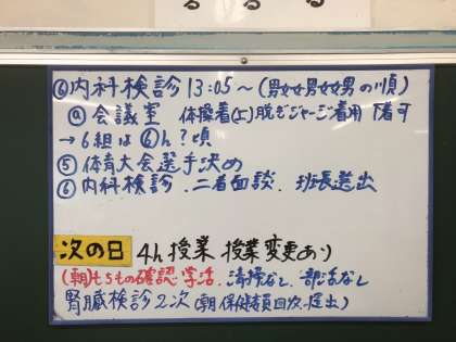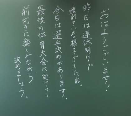 5月8日(水)の朝に校内を巡回していたら、3年生の教室の黒板に学級担任の先生から生徒の皆さんへのメッセージが書いてありました。