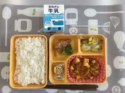 今日の ランチ は、ごはん、キムチ豆腐、鶏肉のスタミナ焼き、アスパラサラダ、チーズ、牛乳です。