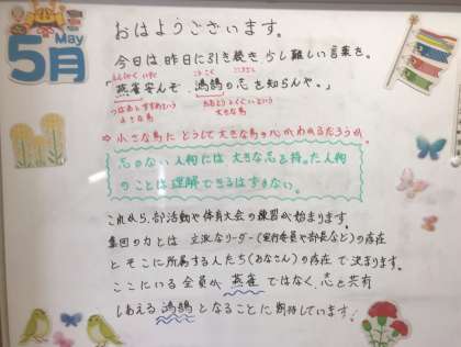 1学年主任の先生からのメッセージ 公開日 2024/05/11 更新日 2024/05/11 お知らせ 5月8日(水)に校内を巡回していたら、1学年のフロアーに学年主任の先生から生徒の皆さんへのメッセージが書いてありました。