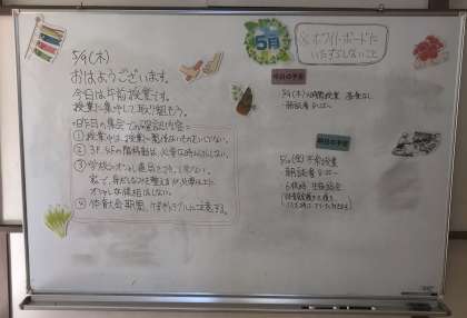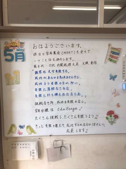 1.2学年主任の先生からのメッセージ 公開日 2024/05/11 更新日 2024/05/11 お知らせ 5月9日(木)に校内を巡回していたら、1.2学年のフロアーに学年主任の先生から生徒の皆さんへのメッセージが書いてありました。