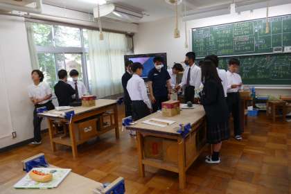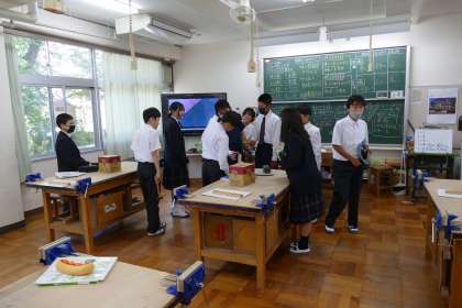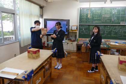 「材料と加工の技術」の単元で、生徒の皆さんは木材の特徴について、実験をしていました。