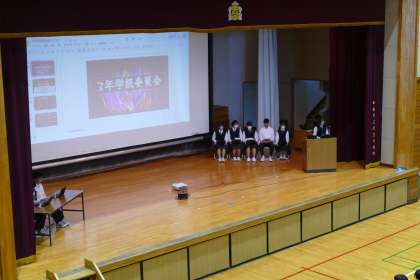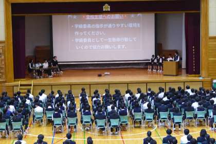 はじめに、生徒会本部からスローガンや活動方針、活動計画、活動内容、具体的な活動等の説明がありました。