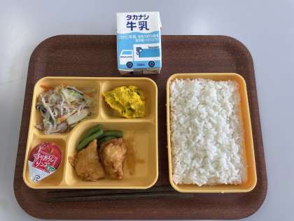 今日のランチは、ごはん、ヤンニョムチキン、チャプチェ風炒め、かぼちゃとさつまいものサラダ、すりおろしりんごミニゼリー、牛乳です。