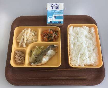 今日の ランチ は、ごはん、白身魚のバジルソテー、ツナマカロニグラタン、青菜のおかか和え、切り干しフレークふりかけ、牛乳です。