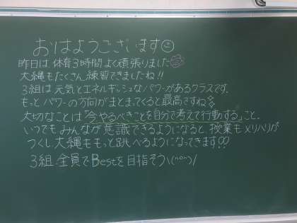 5月21日(火)の朝に校内を巡回していたら、1年生の教室の黒板に学級担任の先生から生徒の皆さんへのメッセージが書いてありました。