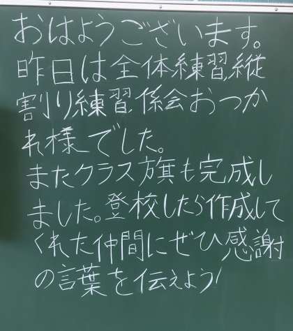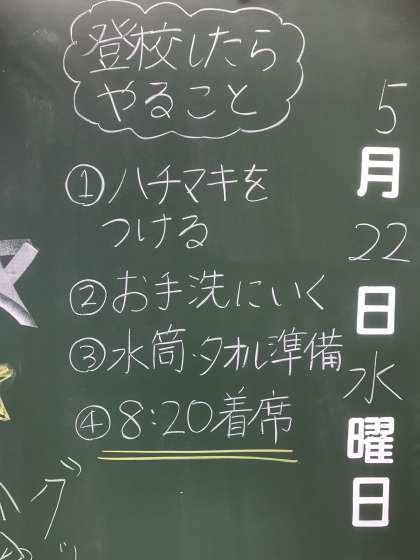 5月22日(水)の朝に校内を巡回していたら、各教室の黒板に学級担任の先生や教育実習生の先生、友達からのメッセージが書いてありました。